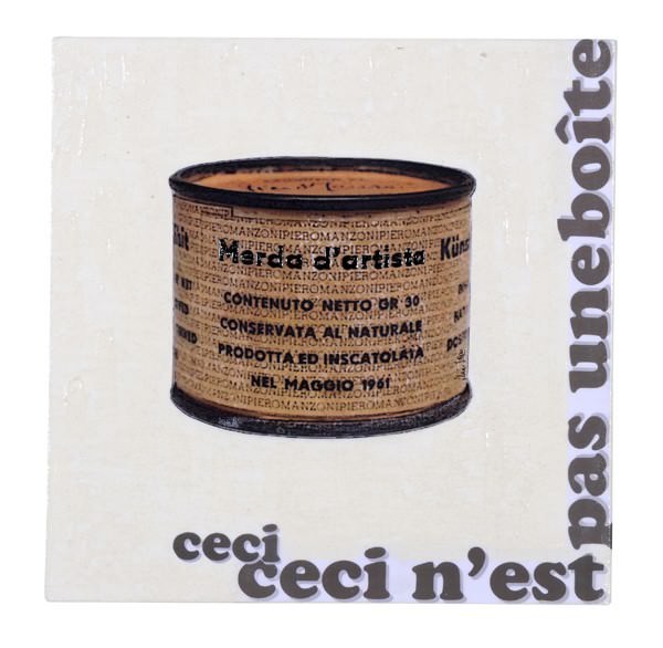 Uovo (la forma perfetta); carta igienica (l’oggetto forse più usato al mondo); insegna del telefono pubblico italiano (non c’è più!); passaporto (una pagina con l’impronta di un dito: l’identità di ognuno); codice a barre (il codice di ogni oggetto in vendita, unito alla parola “piacere” trasfigurata); “Merda d’artista” di Piero Manzoni: una scatola che non è solo una scatola!); sacchetto di carta di Merci (concept store parigino che propone un nuovo modo di fare beneficenza).