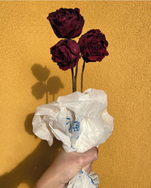 Un fiore disidratato, ormai privo di linfa vitale, viene avvolto in un sacchetto di plastica, come a volerlo offrire simbolicamente in dono. L'immagine, raffinata nella sua essenzialità, si colloca tra il linguaggio della natura morta e quello della denuncia visiva, fondendo poesia e responsabilità in un'unica, silenziosa evocazione.