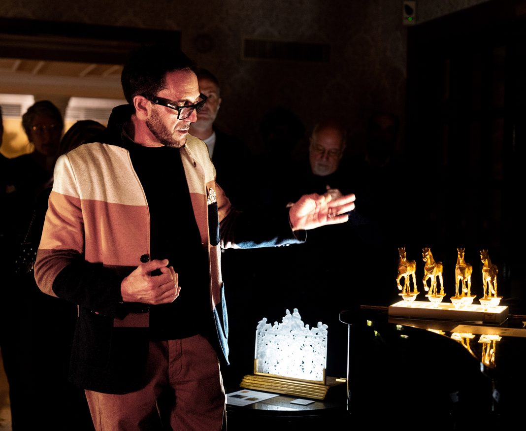 Le opere di Michele Dal Bon sono reinterpretazioni in chiave cubista di capolavori assoluti della scultura antica e moderna, arricchite con la foglia d’oro 24 carati. Questo prezioso materiale non è solo decorativo, ma rappresenta un elemento simbolico, un ponte tra il divino e l’umano, capace di trasmettere un senso di sacralità e di creare un’esperienza visiva unica. Le sculture, infatti, sono illuminate internamente da luci LED, che permettono alla luce di filtrare attraverso il craquelé dell’oro, generando un’esplosione luminosa che esalta i dettagli delle forme e avvolge lo spettatore in un’atmosfera di intensa spiritualità.
