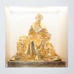 Tra le sculture esposte spicca Nike – Νίκη, una reinterpretazione della Nike di Samotracia, capolavoro dell’arte ellenistica, rimodellata in chiave cubista e decorata con foglia d’oro. Non meno affascinante è Golden Thinker, rilettura de Il Pensatore di Rodin, dove l’artista cattura la tensione fisica e spirituale dell’originale, rendendola ancora più intensa grazie all’oro e alla luce. Amore e Psiche – φιλία esplora il tema dell’amore eterno e dell’unione spirituale, reinterpretando il celebre abbraccio della scultura di Antonio Canova. Infine, Golden Pietà si illumina di una nuova vita grazie ai giochi di luce che attraversano l’oro, donando all’opera un’atmosfera carica di emozione e profondità.