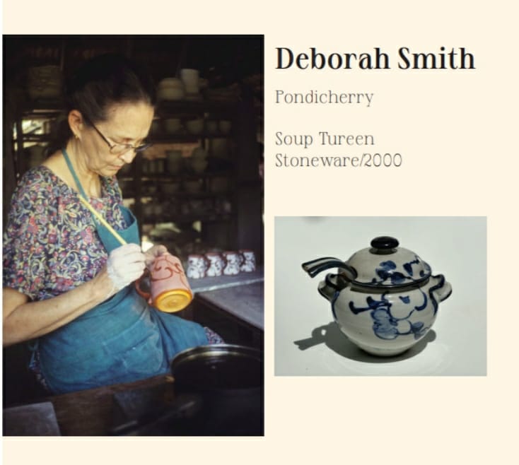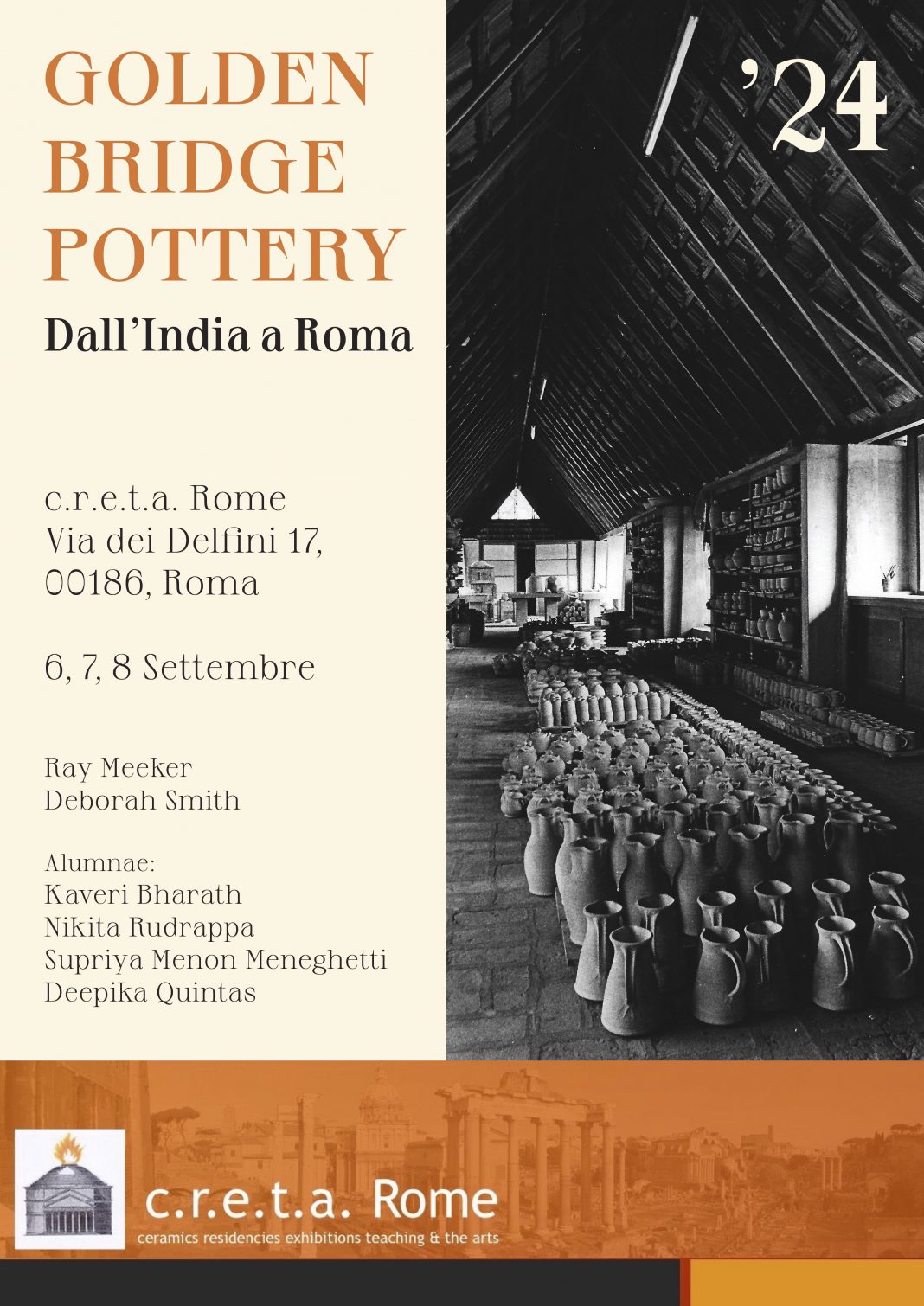 Golden Bridge Pottery: dall'India a Roma: Ray Meeker, Deborah Smith, Supriya Menon Meneghetti, Deepika Quintas, Kaveri Bharath, Nikita Rudrappa, Raji Devta. Fondato nel 1971 da Deborah Smith e Ray Meeker, Golden Bridge Pottery ha ampliato l'arte della ceramica in India e nel mondo. Una dedizione all'ideale di portare la bellezza nella vita reale e rappresenta una forza viva che ha riunito persone creative provenienti da diversi contesti e paesi.