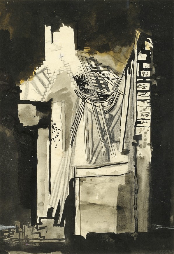 Graham Sutherland (1903-1980), all’inizio della seconda guerra mondiale, viene nominato dal governo inglese war artist (artista di guerra) - Kenneth Clark, direttore in quegli anni della National Gallery, aveva avuto l’idea di ricreare un corpo di artisti di guerra, com’era già avvenuto per il primo conflitto mondiale - e viene quindi mandato a Londra a documentare gli effetti dei bombardamenti. Qui è colpito dapprima dal silenzio - “un silenzio assoluto interrotto soltanto di quando in quando dall’esile tintinnio di un vetro in frantumi” - e dal vuoto che si è creato in vaste aree prima popolate di edifici; e, mentre vaga con il suo album di disegni in quella terra desolata, tra macerie di case e di fabbriche, macchinari distrutti, qualche fuoco che ancora brucia, in un crescendo drammatico realizza come, davanti ai suoi occhi, le forme delle cose si trasformino in altre, esercitando un profondo effetto nelle opere successive e sulla sua coscienza.