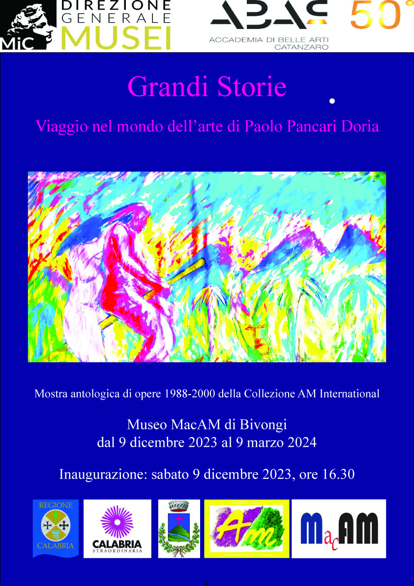 “Grandi Storie. Viaggio nel mondo d’arte di Paolo Pancari Doria” non è solo un omaggio a questo maestro ma anche un contributo doveroso ad un “intellettuale” che lascia un’eredità importan¬te alla sua terra, profondamente amata, e alle generazioni che verranno. Nelle composizioni di Paolo si manifesta tramite diversi personaggi l'uomo che trae riferimento dalla mitologia e dalla letteratura, un racconto di luoghi e persone che furono protagonisti di azioni a volte dirompenti che attendono ancora di essere opportunamente indagate.