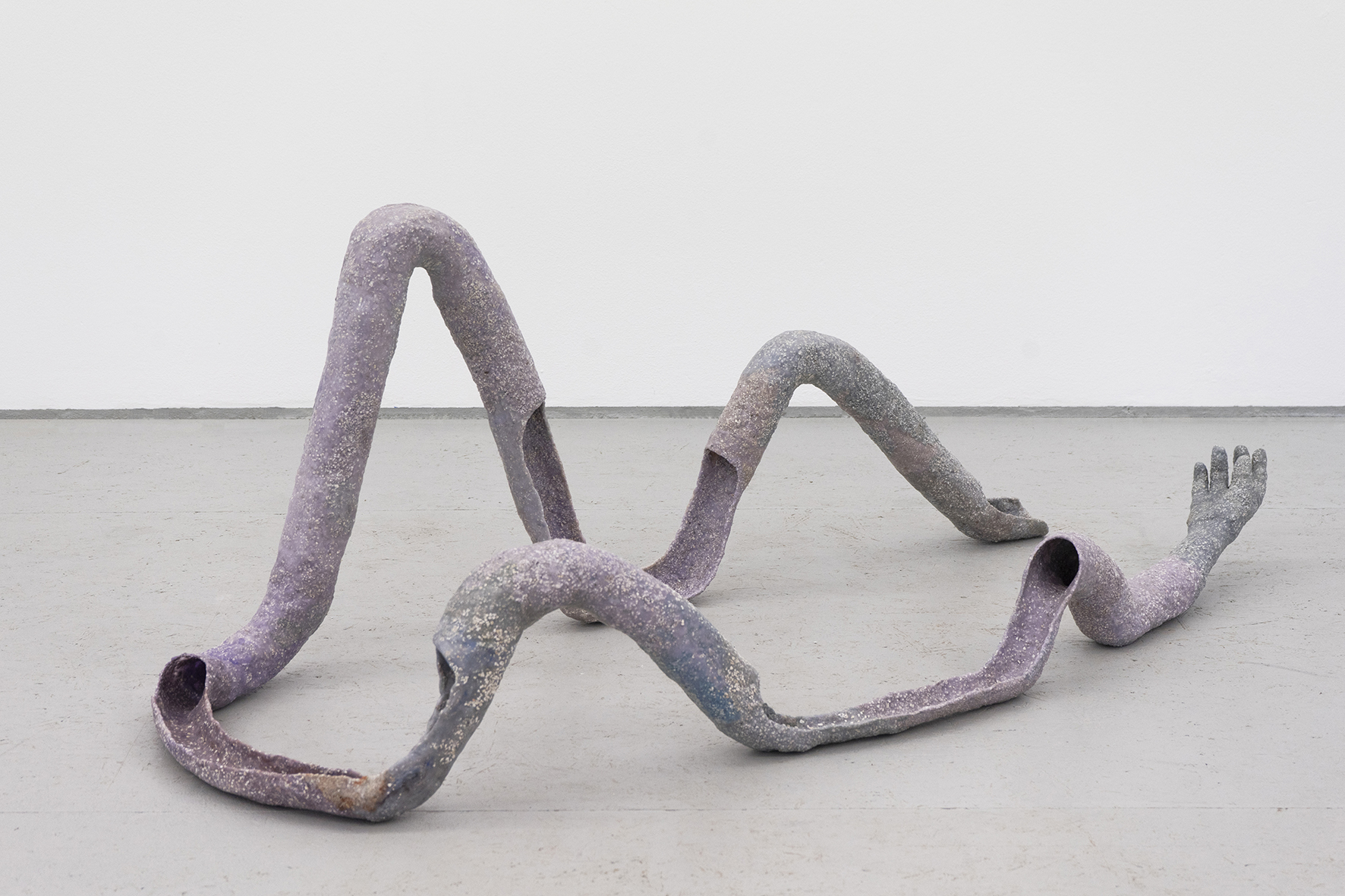 Realizzate principalmente con ritagli di coperte da viaggio distribuite dalle compagnie di volo inter-nazionali (spesso accoppiate con cotone, lino e altri materiali), le composizioni tessili di Teoldi sono animate da silhouettes nell’atto di mostrarsi e nascondersi, cercarsi e respingersi in situazioni di contatto fisico, timidezza o desiderio: quel momento di “quasi” sospensione che invita a rintracciare connessioni e legami possibili. Alludendo anch’esso alla figura umana e alla plasticità dei significati che essa può veicolare, la produzione scultorea di Mickiewicz esplora invece l’orientamento corporeo nel mondo e le svariate modalità con le quali le esperienze interiori si riflettono nei gesti, nella postura e nel movimento del corpo. Il suo lavoro enfatizza anche il ruolo che lo spazio negativo e il vuoto istituiscono con la memoria, spesso intesa come strumento conoscitivo per “completare” mentalmente una forma astratta.
