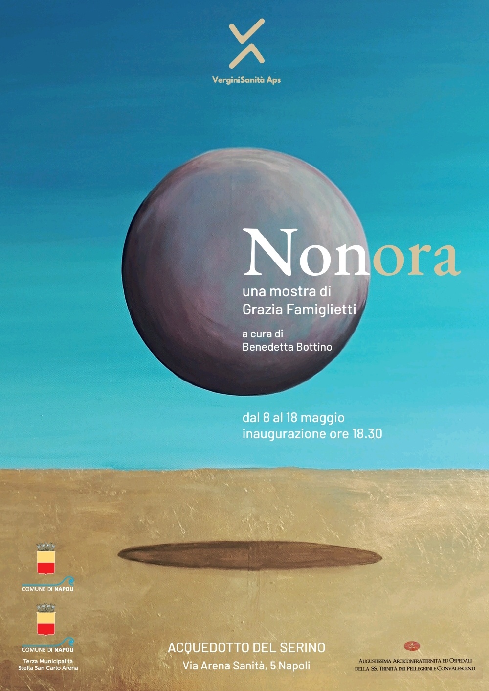 La mostra “NON ORA” dell’artista irpina di adozione napoletana, Grazia Famiglietti esplora il tempo nelle sue molteplici declinazioni: filosofiche, linguistiche e antropologiche, con un focus sulla percezione tipicamente meridionale del futuro come “presente sospeso”.