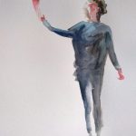 Erede di uno studio e di un percorso grafico orientato alla semplificazione, l’artista attraversa e indaga oggi tutte le sfumature del movimento, descrivendo con le ombreggiature del colore nei muscoli e nelle pieghe delle vesti (di risonanza teatrale), il ritmo corporeo e l’azione, spesso con la ripetizione dello stesso frame che prende in prestito alla fotografia e alla cinematografia. La scoperta di temporalità multiple come congiunzione di ritmi eterogenei in processi tensivi sempre nuovi, sembrano riferirsi al carattere futurista del dinamismo, che assume qui un senso di delicata morbidezza che impercettibilmente, tende a dissolversi. “
