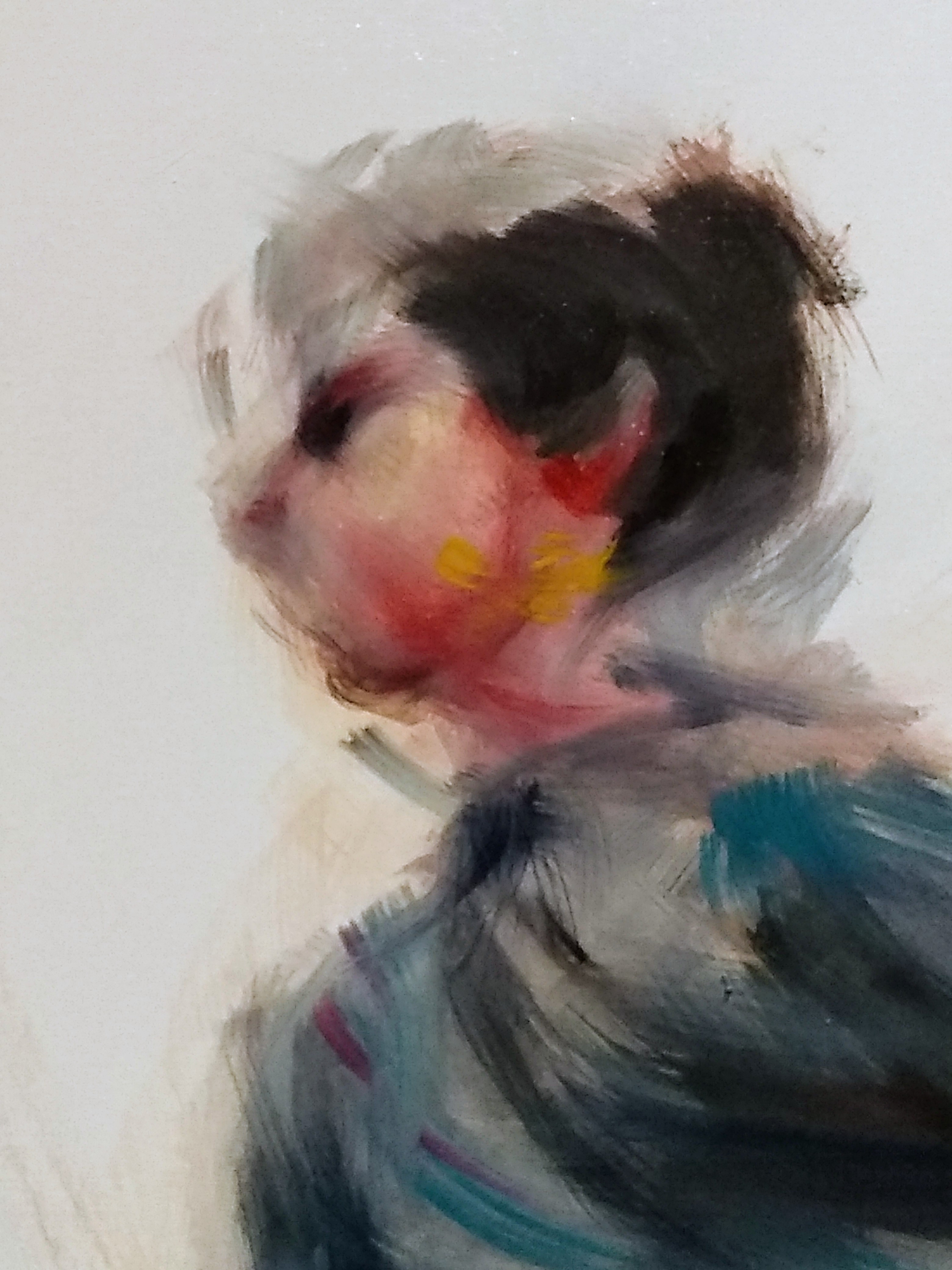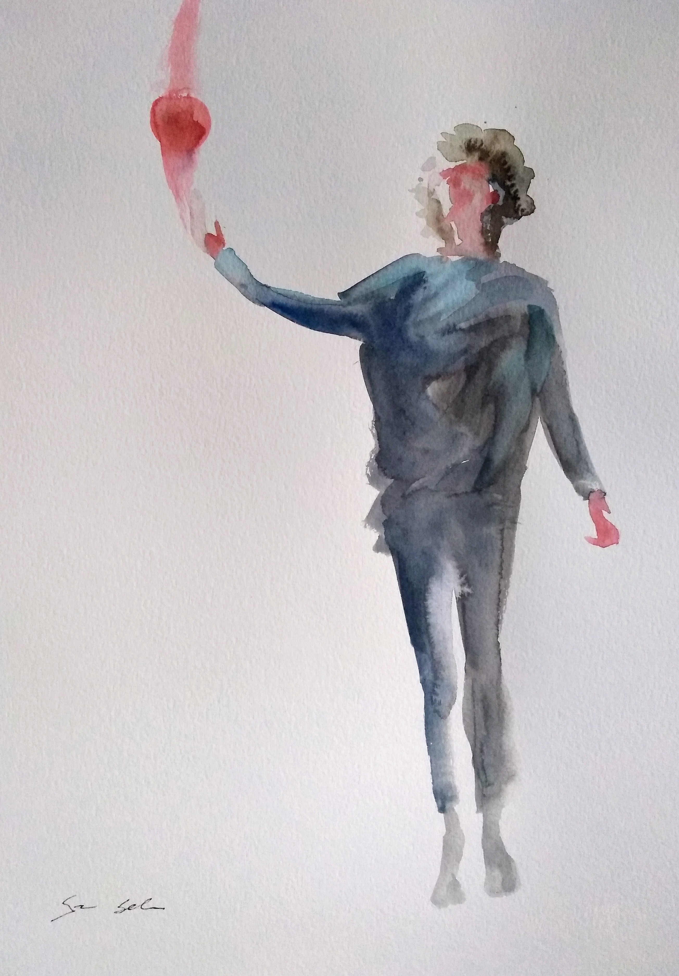 Erede di uno studio e di un percorso grafico orientato alla semplificazione, l’artista attraversa e indaga oggi tutte le sfumature del movimento, descrivendo con le ombreggiature del colore nei muscoli e nelle pieghe delle vesti (di risonanza teatrale), il ritmo corporeo e l’azione, spesso con la ripetizione dello stesso frame che prende in prestito alla fotografia e alla cinematografia. La scoperta di temporalità multiple come congiunzione di ritmi eterogenei in processi tensivi sempre nuovi, sembrano riferirsi al carattere futurista del dinamismo, che assume qui un senso di delicata morbidezza che impercettibilmente, tende a dissolversi. “