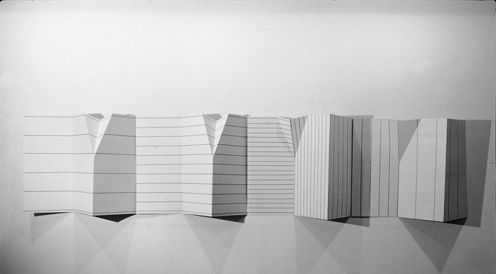 Immagine: Grazia Varisco. Grande Dépliant, 1983/84, smalto su cartone milleonde (4 elementi), 105 x 600 x 25 cm.