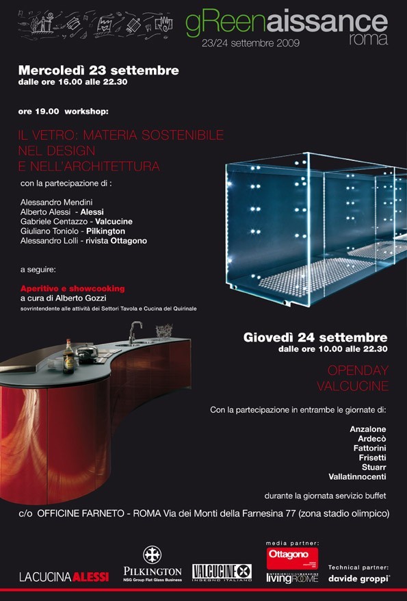 Il tema sarà incentrato sul vetro come materia sostenibile nel design e nell’architettura e come trait d’union tra Valcucine, LaCucinaAlessi e gli architetti. All’incontro parteciperanno Alberto Alessi e Alessandro Mendini per Alessi, Gabriele Centazzo per Valcucine, Giuliano Toniolo per Pilkington e Alessandro Lolli per la rivista Ottagono. L’appunatmento si concluderà con un lungo aperitivo e con la possibilità di assistere ad un esclusivo showcooking a cura di Alberto Gozzi, sovrintendente alle attività dei Settori Tavola e Cucina del Quirinale. Gli ospiti potranno scoprire come Valcucine utilizza il vetro con tutte le soluzioni tecnologiche adottate all’interno dell’esposizione.
