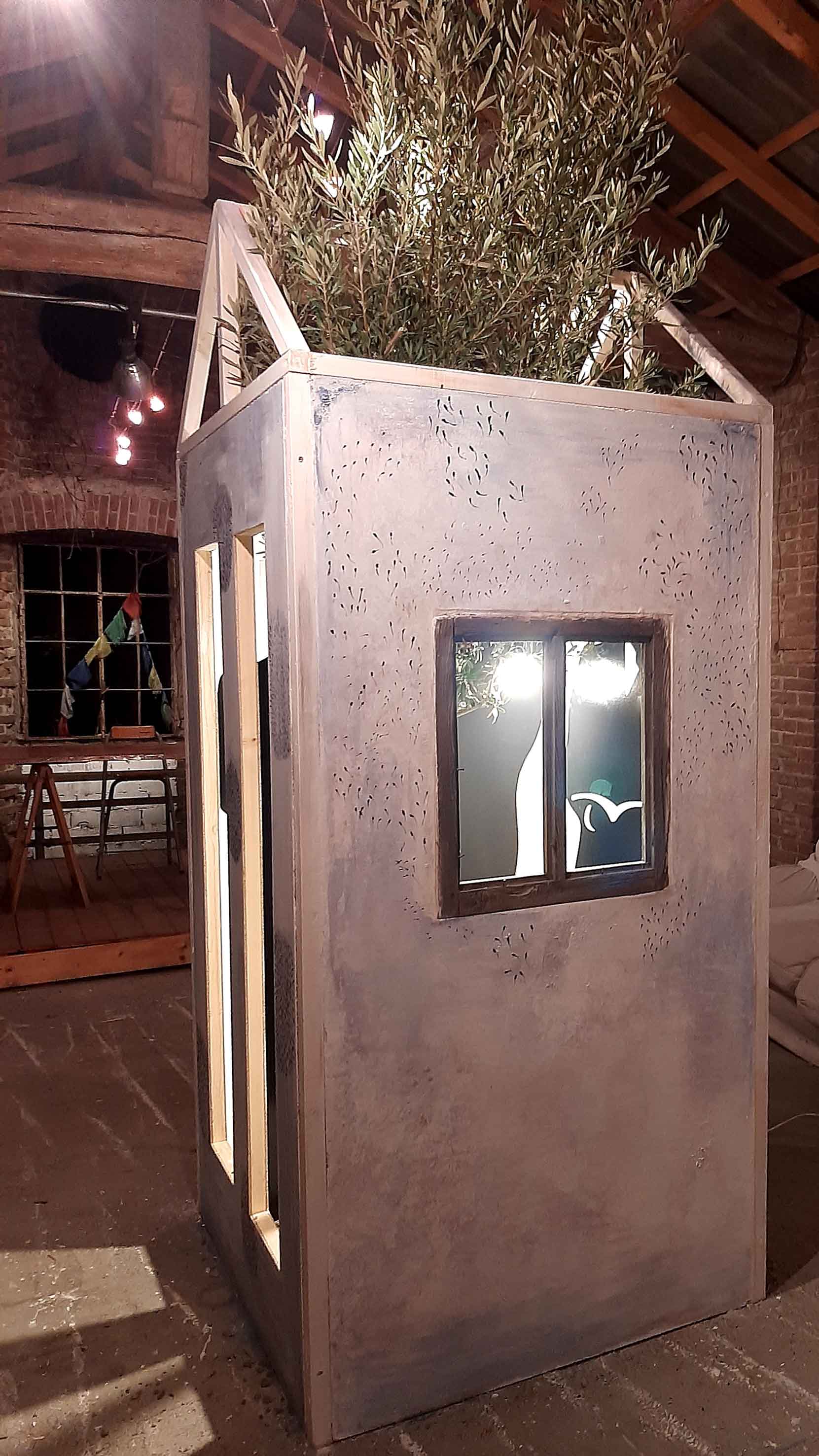 È una piccola casa e si collega al concetto junghiano della casa onirica, è simbolica, è surreale, come surreale è il momento che stiamo vivendo, commento al mondo della sua ideatrice. Fa parte di un suo ciclo di lavori narrativi in cui l’arte si lega all’antropologia all’incontro con l’altro.