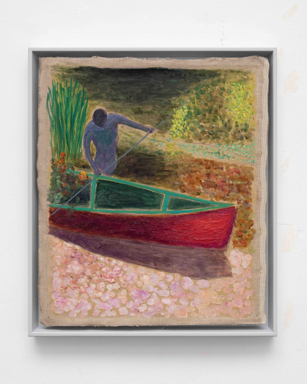 The paintings are inhabited by green, gray, and purple figures, mystical landscapes, and fierce beasts. Inner spiritual states have been turned into exotic patterns. A man fighting a beast, a ship aground on a shore and another one on fire, red skies and gray waters landscapes. Such content opens to a layered interpretation and demands an attempt to decipher the artistic codes embedded in the paintings’ matter. The artist often returns to the same pattern until the painting’s potential that attracted him is exhausted.