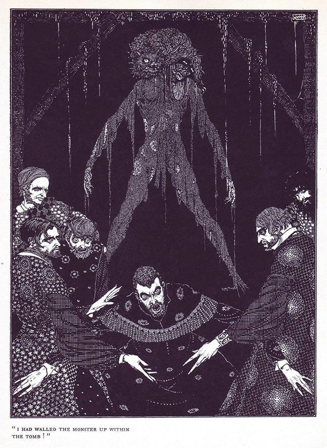 La quinta Danze macabre e orrori della guerra contiene svariate rappresentazioni dello scheletro legate alla Totentanz e alla Morte e la fanciulla ad opera di Marcel Roux, Karl Reisenbichler, August Brömse, James Ensor, Odilon Redon, Alfred Kubin, Jan Konůpek e le edizioni dei racconti di Edgar Allan Poe illustrate da Harry Clarke, Henri Evenepoel e Romeo Costetti. Il tema della guerra con le sue atrocità è rappresentato invece da alcune terrificanti incisioni dalla serie Guerro di Valère Bernard. La sesta Le tenebre e la luce è la sezione che più aderisce dal punto di vista stilistico all’artificio dell’arabesco. Il virtuosismo disegnativo e incisorio, capace di creare sapienti giochi di neri profondi accostati a bagliori di luce mediante l’uso della china oppure dell’acquatinta, evoca sogni, visioni, incubi e allucinazioni in cui si possono scoprire anche i prodromi della dark fantasy art contemporanea. Si va dalle atmosfere notturne di Rudolf Jettmar a quelle angoscianti di Marcel Roux dalla raccolta Variations, insieme a una serie di libri come Hamlet di Shakesperare illustrato da John Austen, The rime of the ancient mariner di Coleridge illustrato da Willy Pogany fino alle inquietanti favole figurate nel gusto Jugendstil da Wilhelm Schulz.