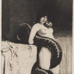 A complemento di questa indagine nelle varie sfaccettature della grafica legata al Simbolismo storico si è voluta creare un’appendice a cura di Silvia Scaravaggi che evidenzia in quattro artisti contemporanei le connessioni con quella cultura figurativa: Agostino Arrivabene, Simona Bramati, Edoardo Fontana e Sonia De Franceschi. Se può essere riduttivo definirli “neo-simbolisti”, essi hanno in comune una matrice immaginifica che si nutre a vari livelli di quelle fonti riattualizzandole, ognuno attraverso la propria originale sensibilità. In mostra saranno esposte alcune incisioni di Arrivabene connesse al percorso della sua pittura, di cui rispecchiano la grazia e il potere simbolico, tra queste la preziosa acquaforte Vergine fossile; accanto ad esse gli acquerelli di Bramati portano nell’oggi enigmatiche figurazioni di faunesse e centauresse con una qualità espressiva evanescente e onirica. Le xilografie di Fontana, scelte dai cicli Salomè e Nekya, quest’ultimo ispirato al vampirismo e all’evocazione dei morti, fanno emergere iconiche figure delineate da un tratto rigoroso e peculiare, mentre le incisioni di De Franceschi si ispirano al disegno lineare di Aubrey Beardsley per tradurre calcograficamente l’effetto del line block print in una atmosfera dark e fantastica.