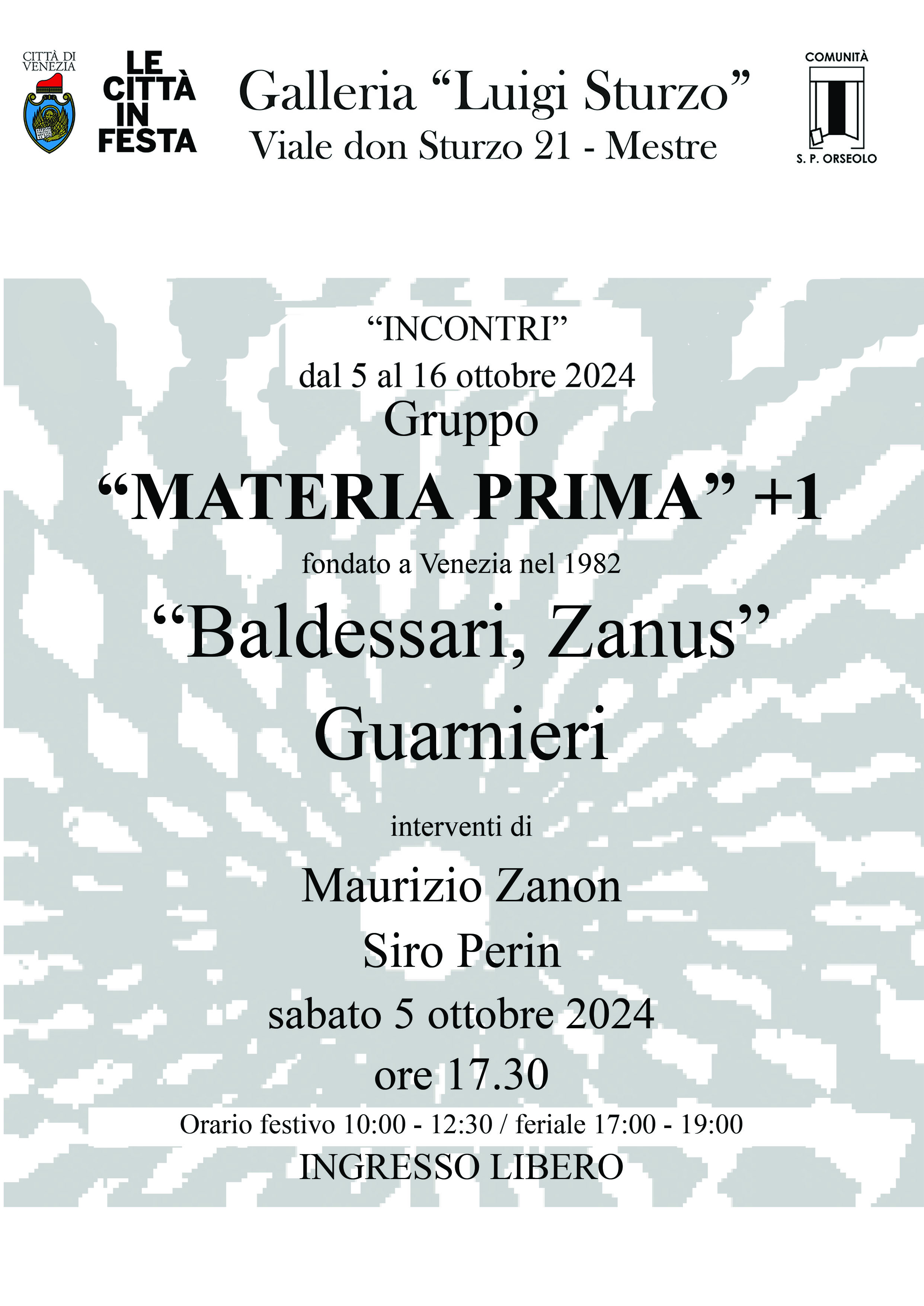 Sabato 5 settembre alle ore 17:30 presso la Galleria “Luigi Sturzo” a Venezia Mestre, all'interno della rassegna “Incontri”, si inaugura la mostra MATERIA PRIMA +1. Durante l'inaugurazione saranno lette alcune poesie di Maurizio Zanon.