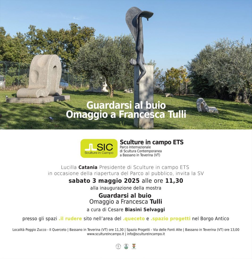 Sculture in campo ETS presenta, sabato 3 maggio, alle ore 11.30, a Bassano in Teverina (VT), presso il nuovo spazio espositivo de Il Rudere (nell’area del Querceto), “Guardarsi al buio”, la mostra omaggio dedicata all’artista Francesca Tulli, prematuramente scomparsa lo scorso anno, con due opere plastiche degli anni 2008/2012. Un secondo nucleo di opere grafiche e scultoree sarà invece visitabile, a partire dalle ore 13,00, presso il Borgo antico, nelle stanze di Spazio Progetti.