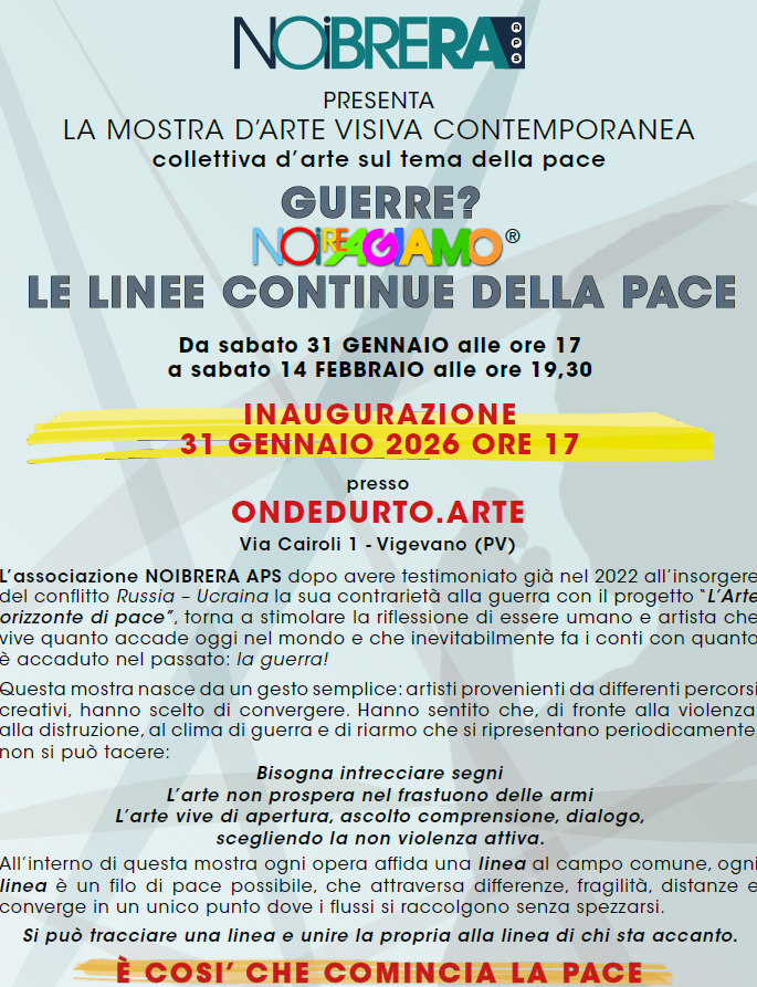 Ospitata questa volta dallo spazio artistico vigevanese Ondedurto Arte, L’associazione NOIBRERA APS dopo avere testimoniato già nel 2022 all’insorgere del conflitto Russia – Ucraina la sua contrarietà alla guerra con il progetto “L’Arte orizzonte di pace”, torna a stimolare la riflessione di essere umano e artista che vive quanto accade oggi nel mondo e che inevitabilmente fa i conti con quanto è accaduto nel passato: la guerra!