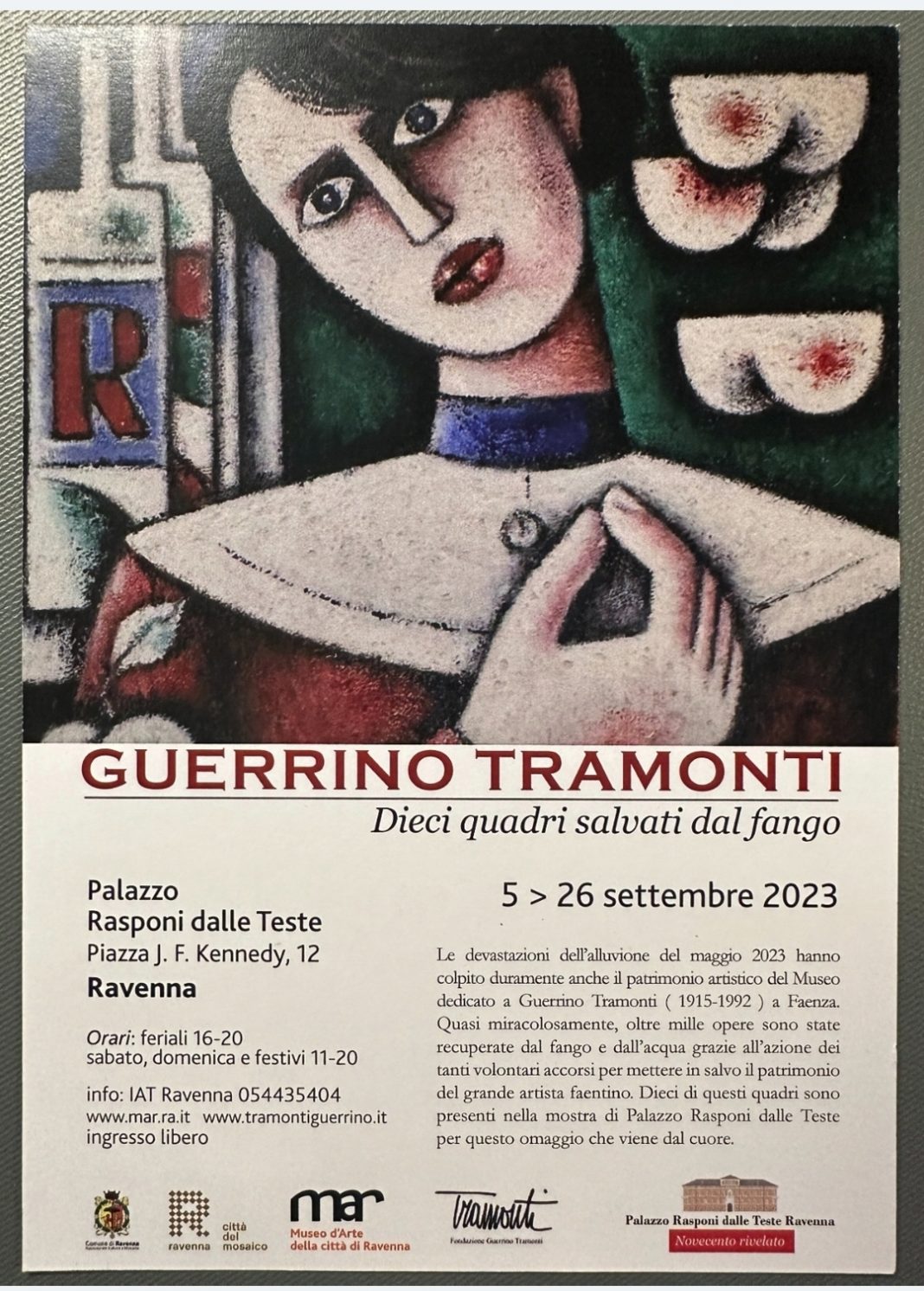 Martedì 29 agosto alle ore 19 a Ravenna in Palazzo Rasponi dalle Teste, aprirà al pubblico la mostra “Guerrino Tramonti: 10 quadri salvati dal fango”. Dopo l’alluvione dello scorso maggio a Faenza, la lotta contro il fango è stata incredibilmente intensa, rapida e i risultati sono stati positivi. Le oltre 2.000 opere custodite nella Casa Museo Guerrino Tramonti, sono andate sommerse e recuperate attraverso una grande mobilitazione volontaria che ha permesso di evitare il peggio, salvando così gran parte del patrimonio artistico e permettendo al Museo di ripartire. Dal MAR e dalla città di Ravenna giunge oggi questo omaggio all’importante “salvataggio” compiuto all’indomani della devastante azione delle acque e del fango.
