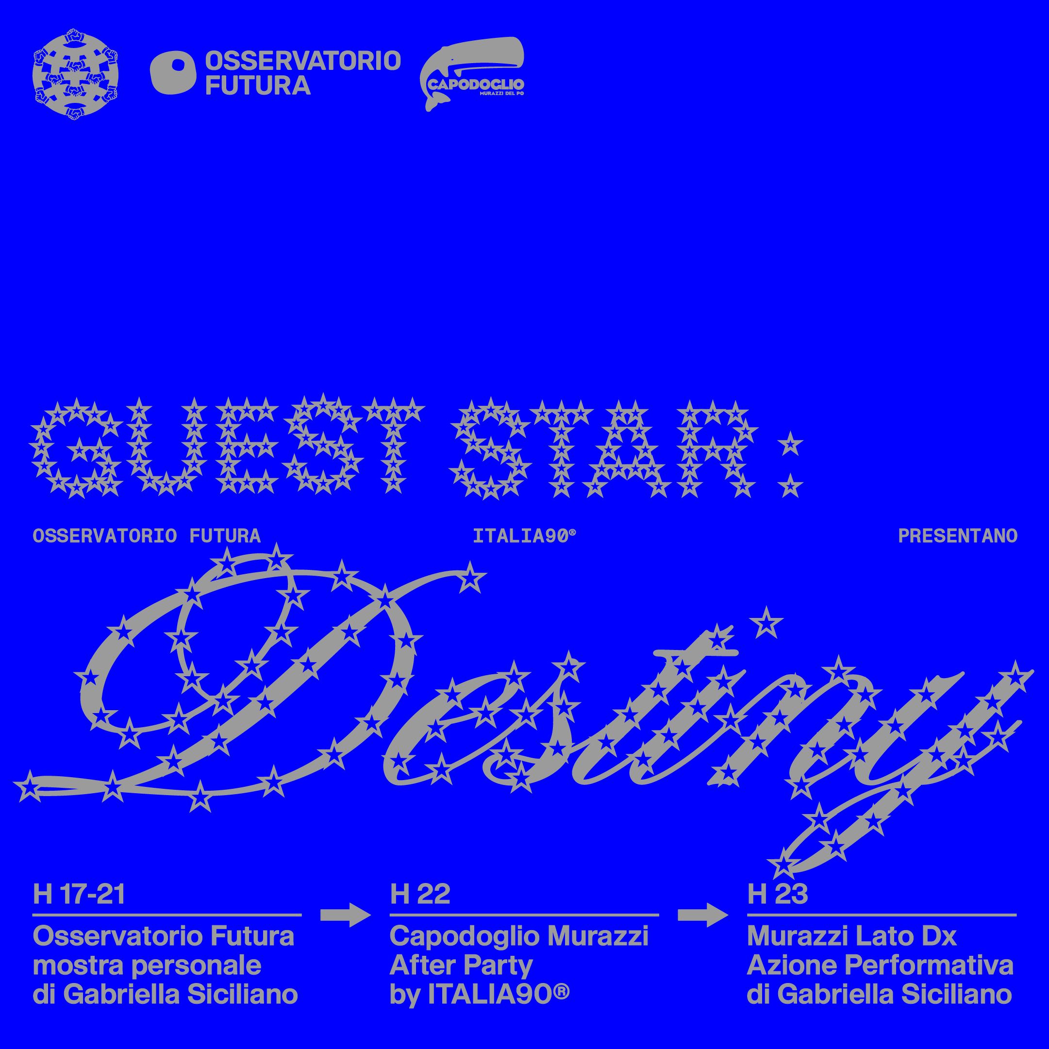 In occasione dell’art week e della notte dell’arte contemporanea, Osservatorio Futura presenta GUEST STAR: Destiny, solo show e azione performativa di Gabriella Siciliano a cura di Francesca Disconzi e Federico Palumbo, con after party Italia90.