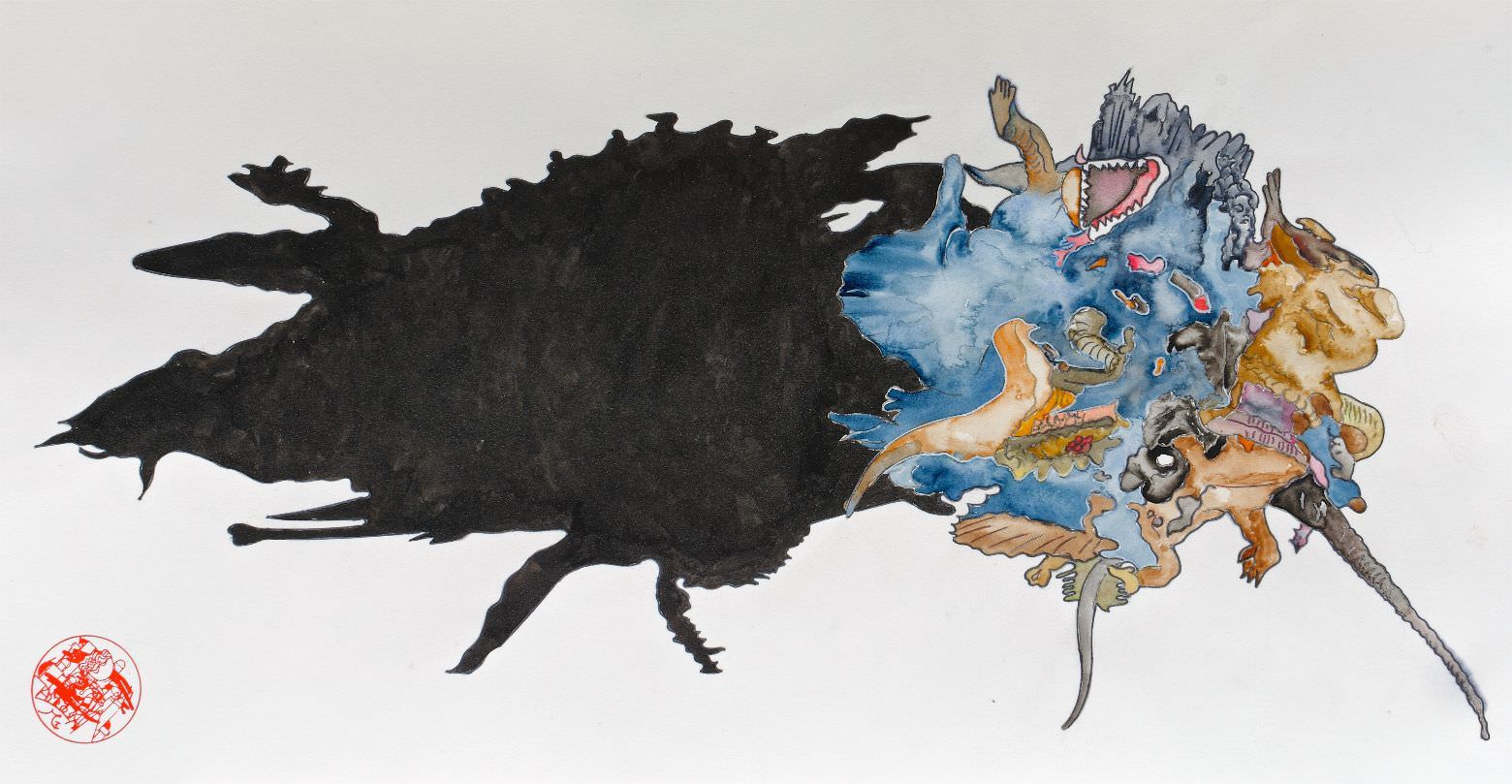 È un simile aspetto che, rivisitato in forme del tutto contemporanee, ritroviamo nel lavoro di Guglielmo Mazzia, nei vorticosi viluppi di rettili e dinosauri, trasfigurati da accensioni di colore talvolta smorzate da lunghe scie d’ombra. Nelle sue carte prende vita una sorta di mostruosità esuberante, che trae energia dalla concentrazione delle masse, mantenendo un tratto di leggerezza nella mobilità e nello slancio del segno che contorna le singole figure. L’afflato fantastico che ne promana non è però semplice gioco visivo: mentre da un lato si fa espressione di una tensione arcaica naturale, sotto altro profilo, collegandosi all’estinzione delle specie ritratte, allude ad una condizione di pericolo che direttamente concerne la condizione precaria del nostro habitat. Viene alla mente allora una riflessione di José Gil: “Probabilmente l’uomo produce mostri per una sola ragione, poter pensare la sua stessa umanità”.