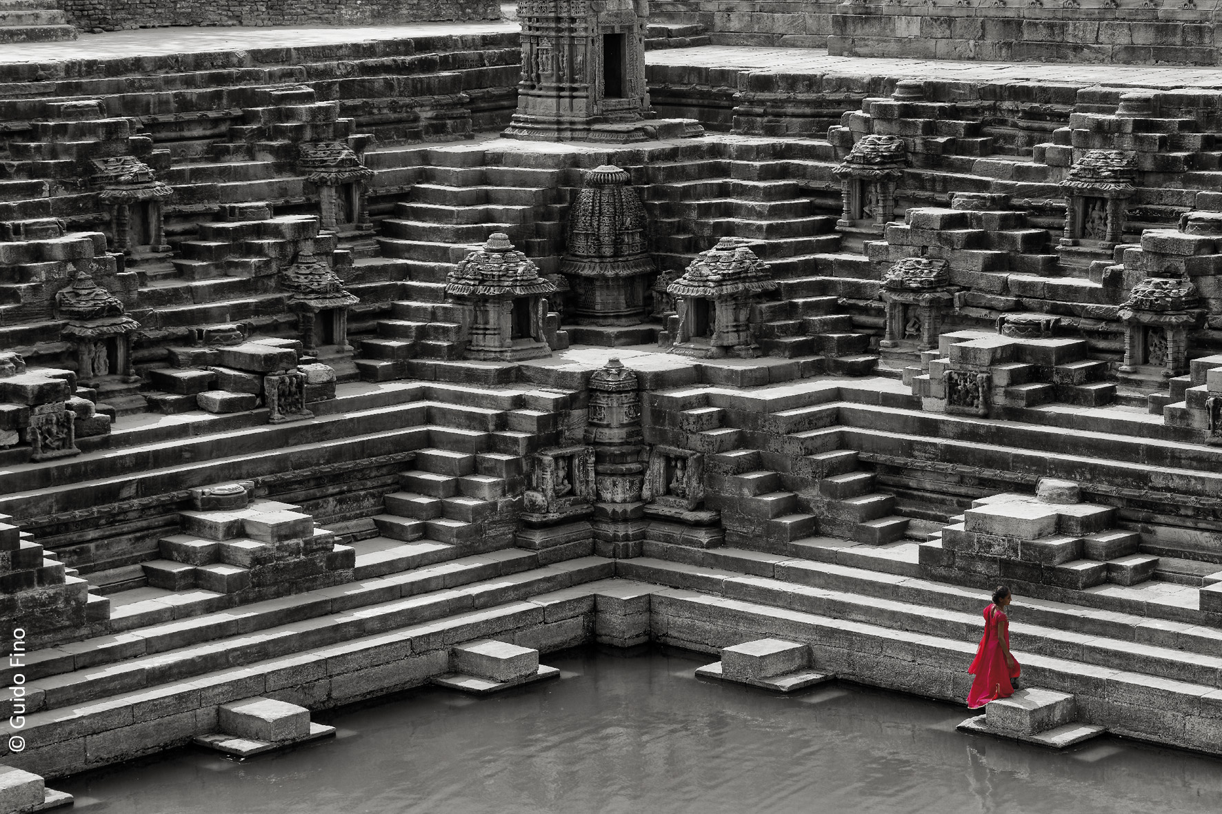 L’architettura è stata compagna costante della vita di Guido, dagli studi all’attività professionale, diventando soggetto privilegiato della sua ricerca fotografica, in quanto fonte inesauribile di riflessione: le istantanee di “Architetture” – una scalinata a Parigi, un pozzo in India, un museo a Singapore – catturano la perfezione degli elementi originari e le cicatrici lasciate dal tempo, la rigorosa geometria delle linee e la sorprendente imprevedibilità delle prospettive, gli attimi avvolti dalla solitudine, dove la figura umana e le architetture appaiono come sospese. “Per definire queste immagini si può far ricorso alla definizione di occhio assoluto: una capacità compositiva immediata, che riesce ad isolare, nella realtà che lo circonda, frammenti che sono altrettante visioni, e a farli vivere nella loro essenza; un occhio in grado di individuare, con la sua sensibilità, il momento decisivo e di restituircelo nella frazione di secondo di uno scatto che fedelmente rispecchia l’emozione da cui è scaturito.” In mostra, accanto alle 20 fotografie di “Architetture” anche l’esclusivo e affascinante racconto fotografico del pioneristico viaggio (1977) nelle valli Himalayane dello Zanskar.