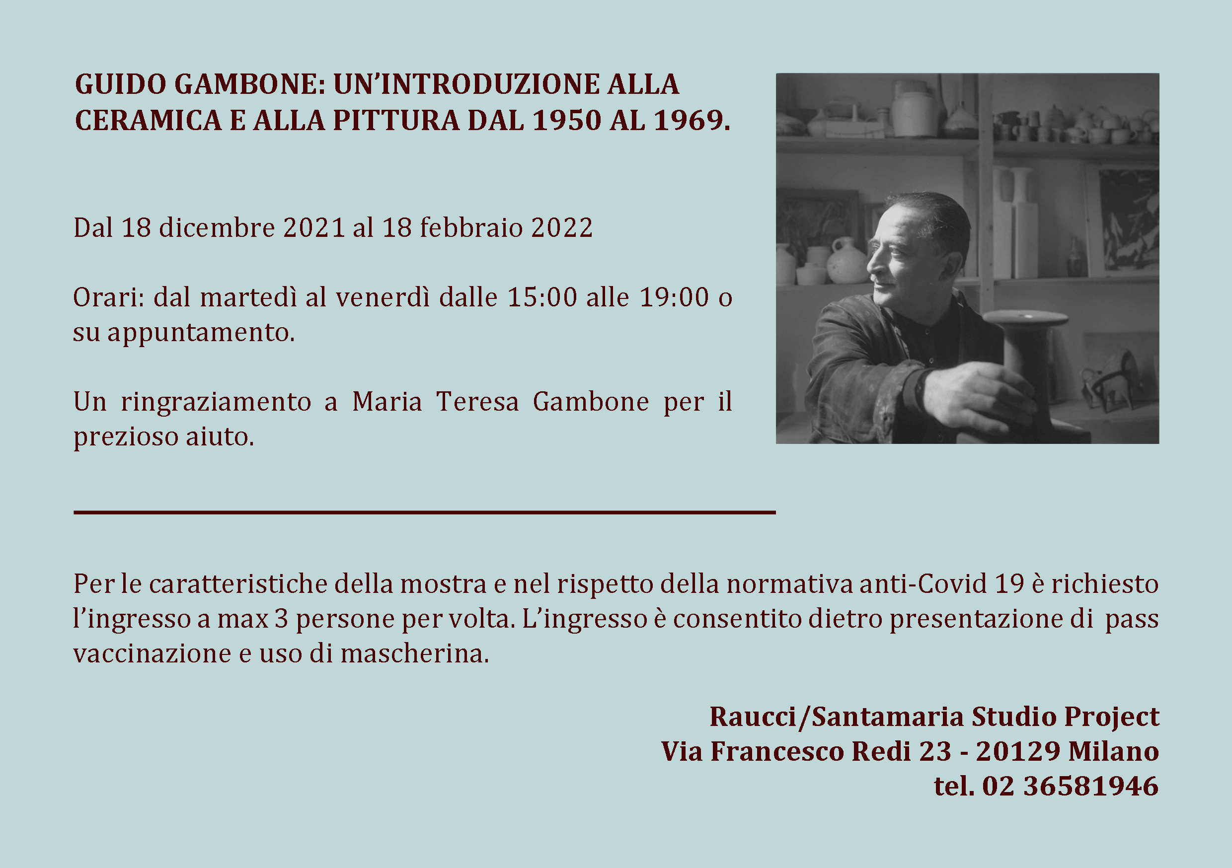 Un’esposizione monografica di Guido Gambone è fondamentale per illustrare e illuminare l’operato di uno dei più importanti protagonisti del mondo della ceramica che hanno dato lustro e sincero significato alla parola eccellenze nel settore dell’artigianato artistico italiano. Questo progetto di mostra, che non pretende di essere completo, rappresenta solo un indizio di ciò che Gambone ha espresso in ceramica e nel campo pittorico. Indaga alcuni aspetti peculiari e fondamentali legati ad un periodo (1950/1969) in cui Gambone conduce una ricerca su forma, decori e gestione del colore, impasti e smalti con cui sperimenta nuove formule dei materiali per produrre oggetti e sculture. Il suo procedere non è mai banale ma è frutto di un maturato senso interpretativo delle correnti artistiche delle moderne avanguardie che oscillano in quegli anni tra astrattismo e informale. L’artista è un attento e sensibile investigatore che non tradirà mai né materia e né forma nel suo operato, anche in quella che oggi definiremmo come produzione seriale di design. Ad un occhio attento anche quest’ultima non riproduce passivamente la forma poiché lo smalto e il decoro che la rivestono le danno le connotazioni del pezzo unico. Dalla fine del 1956 Gambone sarà sempre più coinvolto nella sperimentazione degli impasti dei gres e da nuovi decori che rivestiranno i suoi oggetti. Questi nascono come forme essenziali solcati da graffi e linee che incidono la materia che già basta a stessa nella sua forma calibrata e misurata e unicamente arricchita da colori tonali che sono completati dai manganesi o da tinte oscure. Ripercorre un senso arcaico di cui Gambone è stato maestro come se il suo lavoro tendesse ad aprire varchi in cui spazio e tempo si annullano.
