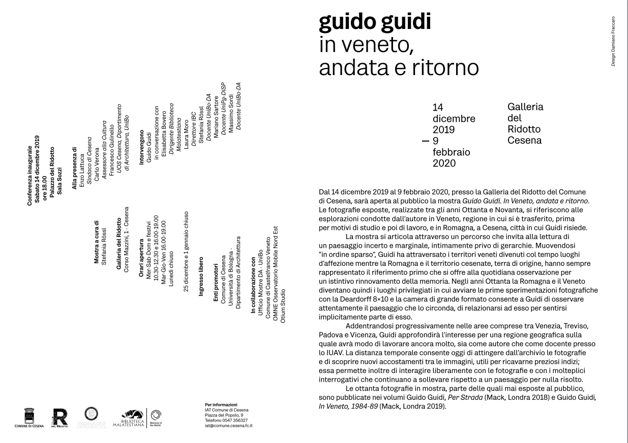 Le fotografie esposte, realizzate tra gli anni Ottanta e Novanta, si riferiscono alle esplorazioni condotte dall’autore in Veneto. 80 le fotografie in mostra, parte delle quali mai esposte al pubblico. Completa la mostra il documentario “Guido Guidi, cose da nulla” (di D. Pezzi e A. Cordelli).