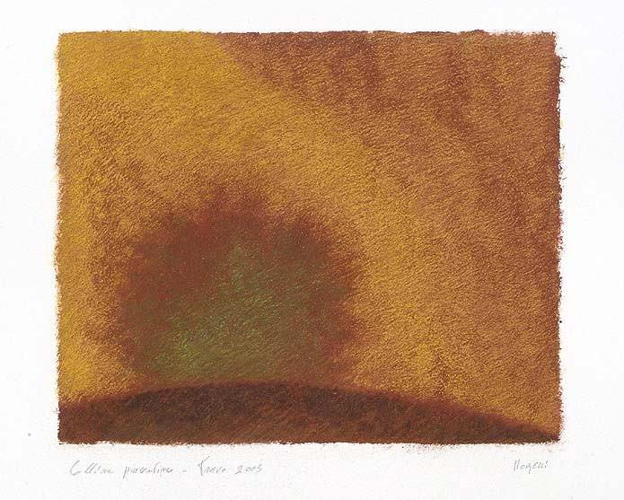 Si tratta di opere per collezionisti raffinati, di fogli carichi di fascino, improntati a un’intensa luminosità e con un colore percepito come “nucleo emozionale”. Si può infatti parlare di colore atmosferico, sia esso celeste come l’aria, o marrone-rosso come la terra, o giallo-oro come un campo di grano, o rosa-pervinca come un tramonto. È un libero spazio di corrispondenze policrome nel quale Morelli imprime una specie di sigillo: la sua purezza, semplificazione e reinterpretazione intuitiva della natura. Emergono così dolci declivi idealizzati che, se non fosse per il titolo dell’esposizione, Colline piacentine, appunto, potrebbero essere scambiati per scorci di paesaggi toscani, altrettanto cari all’artista.