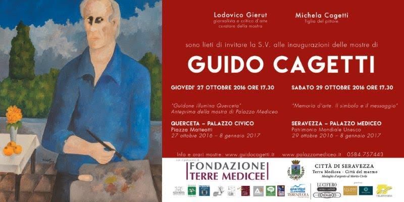 Il Comune di Seravezza rende omaggio al pittore Guido Cagetti (Seravezza 1935-Viareggio 2013) tramite una retrospettiva che si terrà sia nel prestigioso spazio di Palazzo Mediceo (Patrimonio Mondiale Unesco), sia nel Palazzo Civico di Querceta. L'esposizione, arricchita da un catalogo realizzato dalle Edizioni Comitato Archivio artistico-documentario Gierut, curato dal critico d'arte e giornalista Lodovico Gierut, ha testi dello stesso Gierut e interventi di Riccardo Tarabella e di Giacomo Genovesi (rispettivamente Sindaco e Presidente della Fondazione Terre Medicee, e Assessore alla Promozione e valorizzazione del Territorio), di Michela Cagetti, figlia dell'artista, nonché di Marilena Cheli Tomei, Gian Paolo Giovannetti, Alvaro Matteucci, Paolo Marafetti, Marco Martini, Mauro Vannucci, Giancarlo Costa, Fabrizio Vizzoni, Franco Vizzoni e Francesco Franceschini. La pubblicazione, con realizzazione Grafica e supporto fotografico di Marco Costa, propone – come globalmente nelle due sedi espositive – un centinaio tra le tante opere pittoriche e grafiche di Cagetti, persona riservata che, per scelta, ha esposto solo in pochissime occasioni, e i cui lavori erano stati conservati dal medesimo in una stanza della sua abitazione. Con “Guidone illumina Querceta” il 27 ottobre si aprirà a Querceta l'anteprima (inaugurazione ore 17,30) con esposizione sino all'8 gennaio 2017 (aperto tutti i giorni, ingresso libero, dalle 8,00 alle 19,30), mentre il Palazzo Mediceo di Seravezza ospiterà “Memoria d'arte. Il simbolo e il messaggio”, inaugurazione sabato 29 ottobre 2016, ore 17,30, sino all'8 gennaio 2017 tutti i venerdì, sabato e domenica (festività comprese) dalle 15,00 alle 19,00. Ingresso libero.