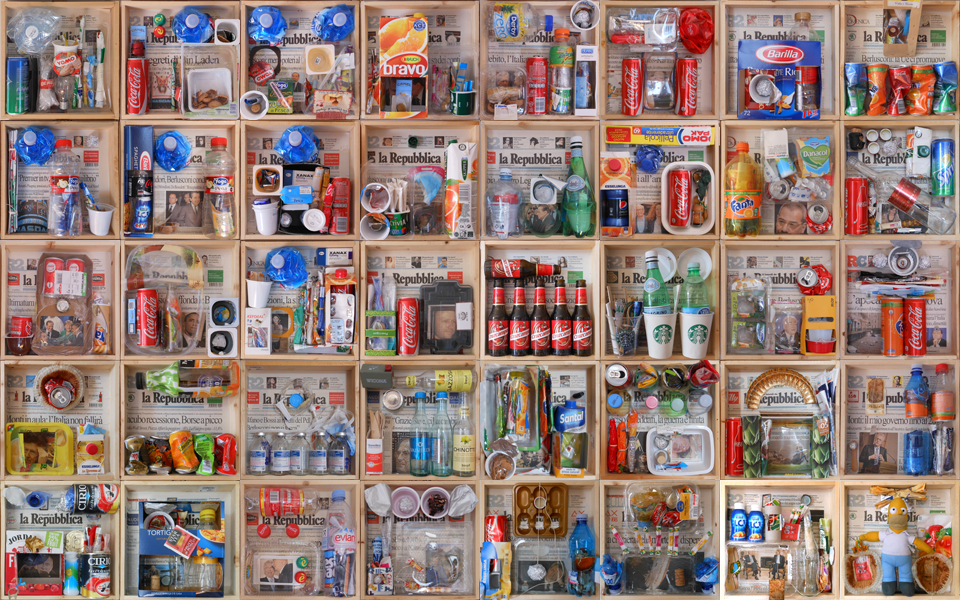 Installazione 365, una raccolta di tutta la spazzatura non organica giornaliera, una sorta di diario intimo in