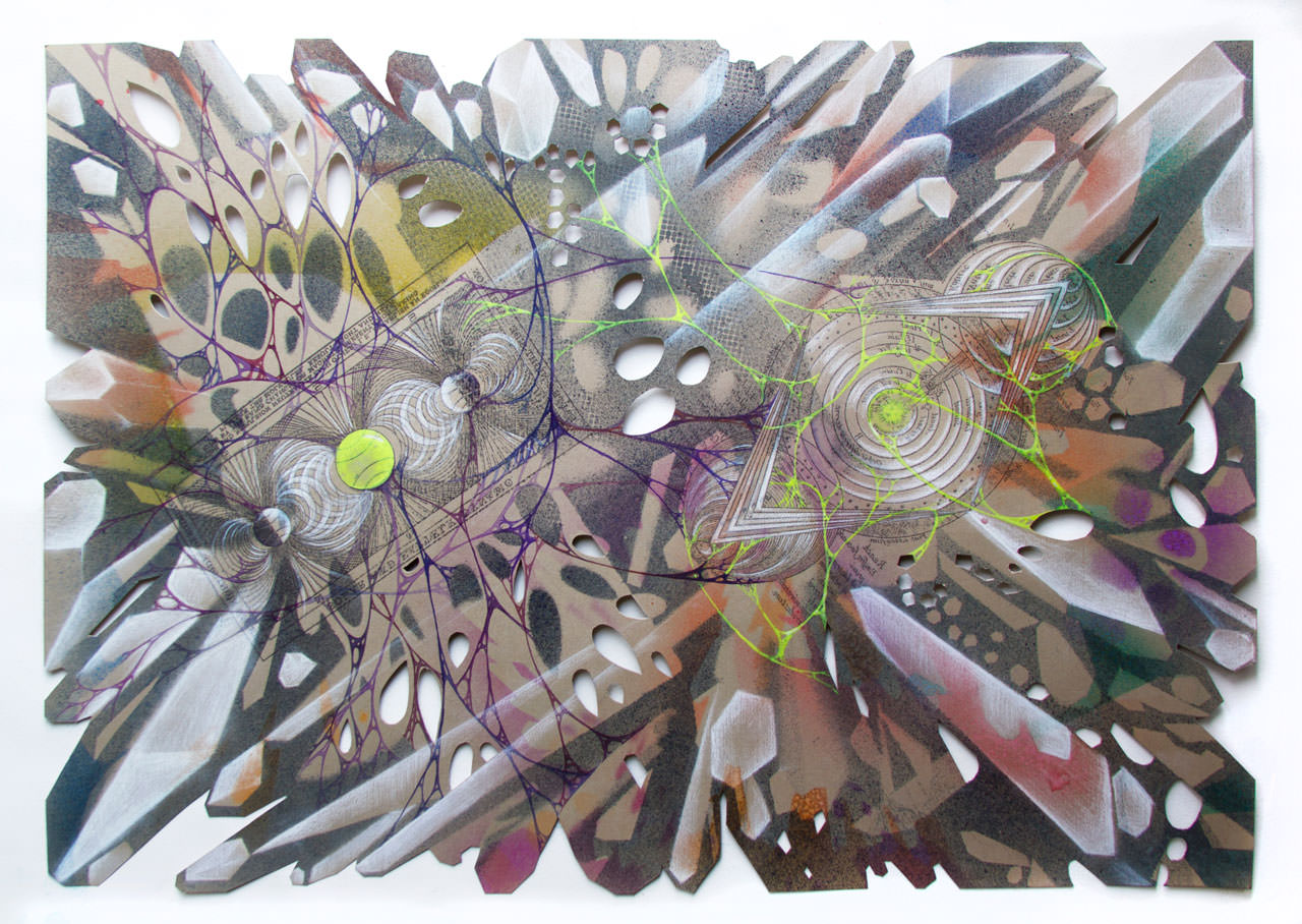 Le equazioni di Maxwell sono del 1865, anche se la loro influenza perdura fino alla meccanica quantistica e al terzo millennio. Nel dipinto su carta, le due autrici, madre e figlia, hanno ritagliato spazi vuoti, segmentato i contorni, tracciato nervature linfatiche, tendini colorati che assomigliano molto ad alcune rappresentazioni dell’iperspazio viste nei film di fantascienza. È un mondo strano. Le loro composizioni fanno pensare a dei cristalli che contengono mondi. E ne suggeriscono altri. Siamo lontani anni luce dalla fiducia progressiva nella scienza dei futuristi. È vero che le equazioni precedono il manifesto di Marinetti & Co. e che proprio nei primi anni del ‘900 rilasciavano i loro cerchi concentrici nella ricerca scientifica e nell’applicazione tecnologica. In altre opere, i grafici, i diagrammi che Gulia (madre) e Karolina (figlia) mettono all’interno delle loro opere come centri di gravità impermanente, sono ancora più vecchi. Addirittura antichi, come nel caso di un acrobatico ricciolo di Albrecht Durer, una misurazione, attorno a cui il colore si addensa. Ma il punto, ancora una volta, è nella percezione. Dalla pubblicazione del manifesto futurista – pieno di passione per elettricità, utopie e distopie – è passato più di un secolo. In questi 107 anni c’è una quantità di cose: la teoria della relatività generale di Einstein e il principio di indeterminazione di Heisenberg, la bandiera americana sulla luna e il monolite fluttuante nella celluloide di Stanley Kubrick. Ci sono i buchi neri, i mondi subatomici dove tutto pare possibile, i telescopi spaziali. I raggi B che balenano nel buio vicino alle porte di Tannhauser visti da un replicante, tanto per citare un altro capolavoro della fantascienza. Le onde gravitazionali, appena scoperte. L’elettricità è diventata – o meglio è tornata – misteriosa. E l’avventura dell’arte nello spazio è un salto nell’ignoto.