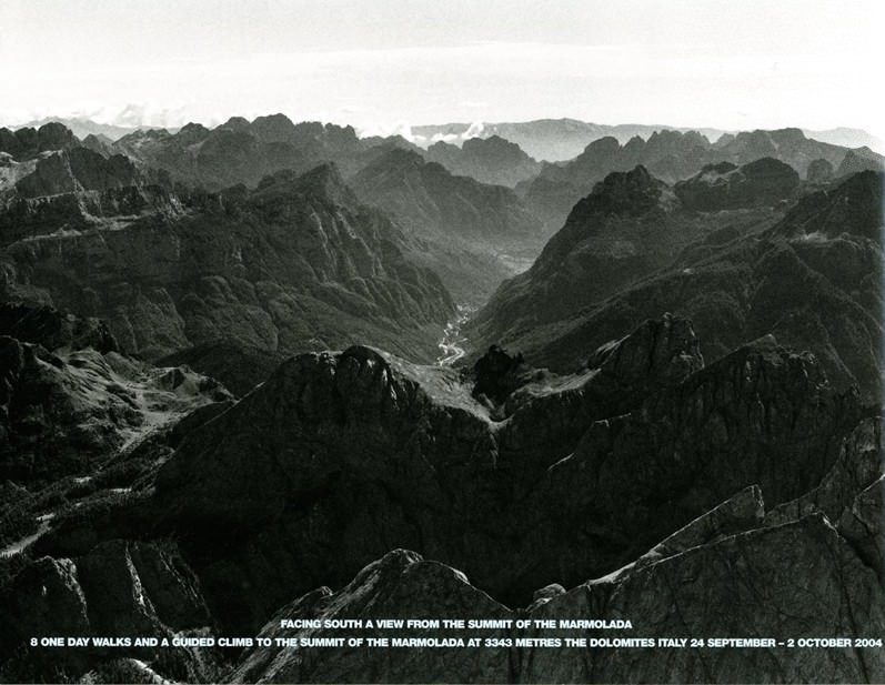 In questa mostra Hamish Fulton presenta una serie di fotografie in bianco e nero, che documentano i suoi ultimi viaggi lungo le Alpi svizzere, nelle Valli della Cina e sulle Dolomiti, alcune installazioni in legno e due wall-drawings.