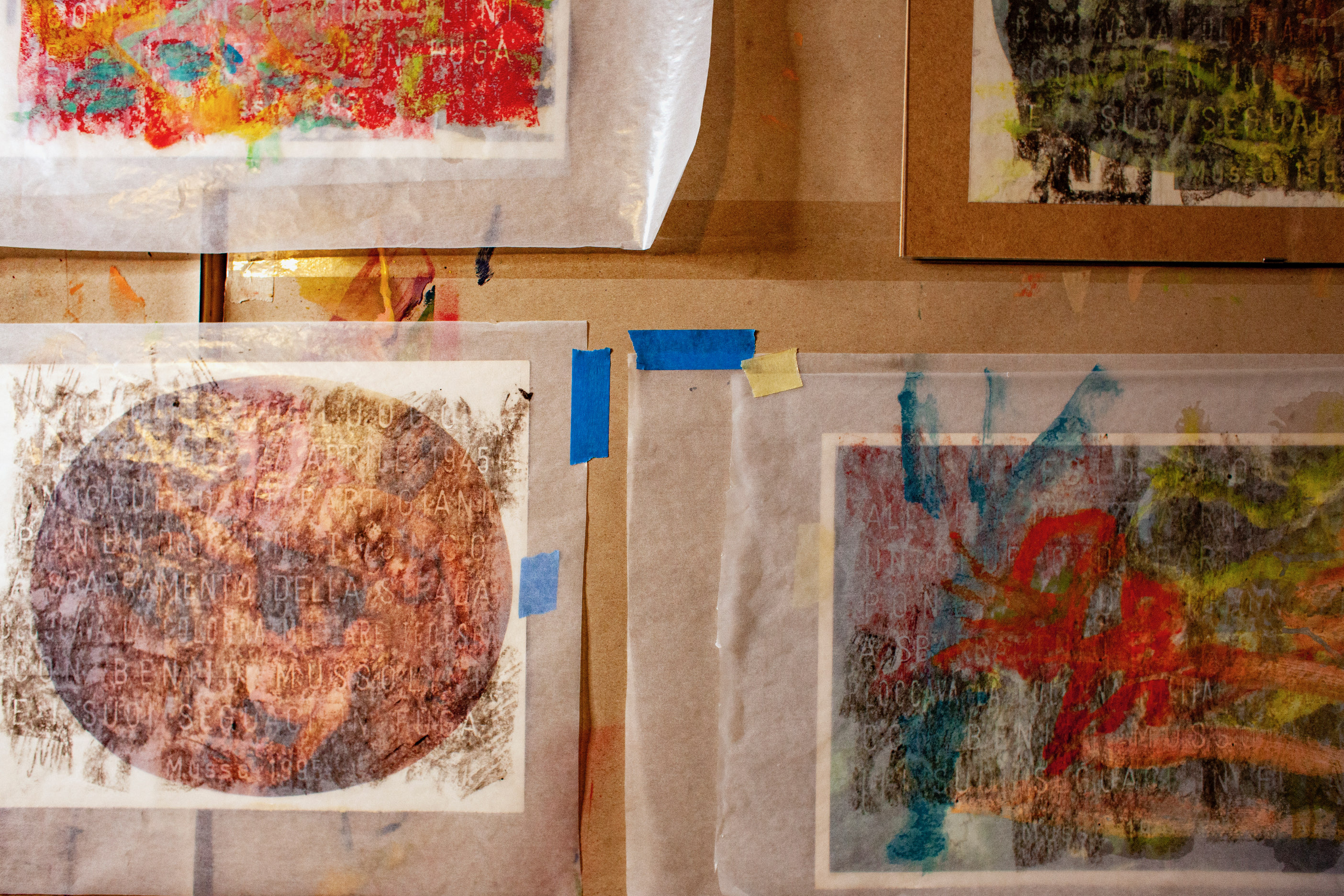 While Embolus is a series of collages mixing superposed prints, drawing and paintings based on a commemorative plaque referring to a WWII Resistance blockade in the vicinity of Menaggio, it also brings to light its contradictory meaning and intent; a blockade for liberation, true paradox of semantics and symbology. This unexpectedly engaging installation, formed by a myriad of layers, is in reality a reflection on memorialization and the duty of remembrance, attempting to operate as a monument to the existential and the factual. On another hand, the word Embolus designates an amalgam in the bloodstream that can cause a blockage, hence hinting at the pragmatic fragility of the body, lodging Han Shan’s practice in the blood and the flesh…
