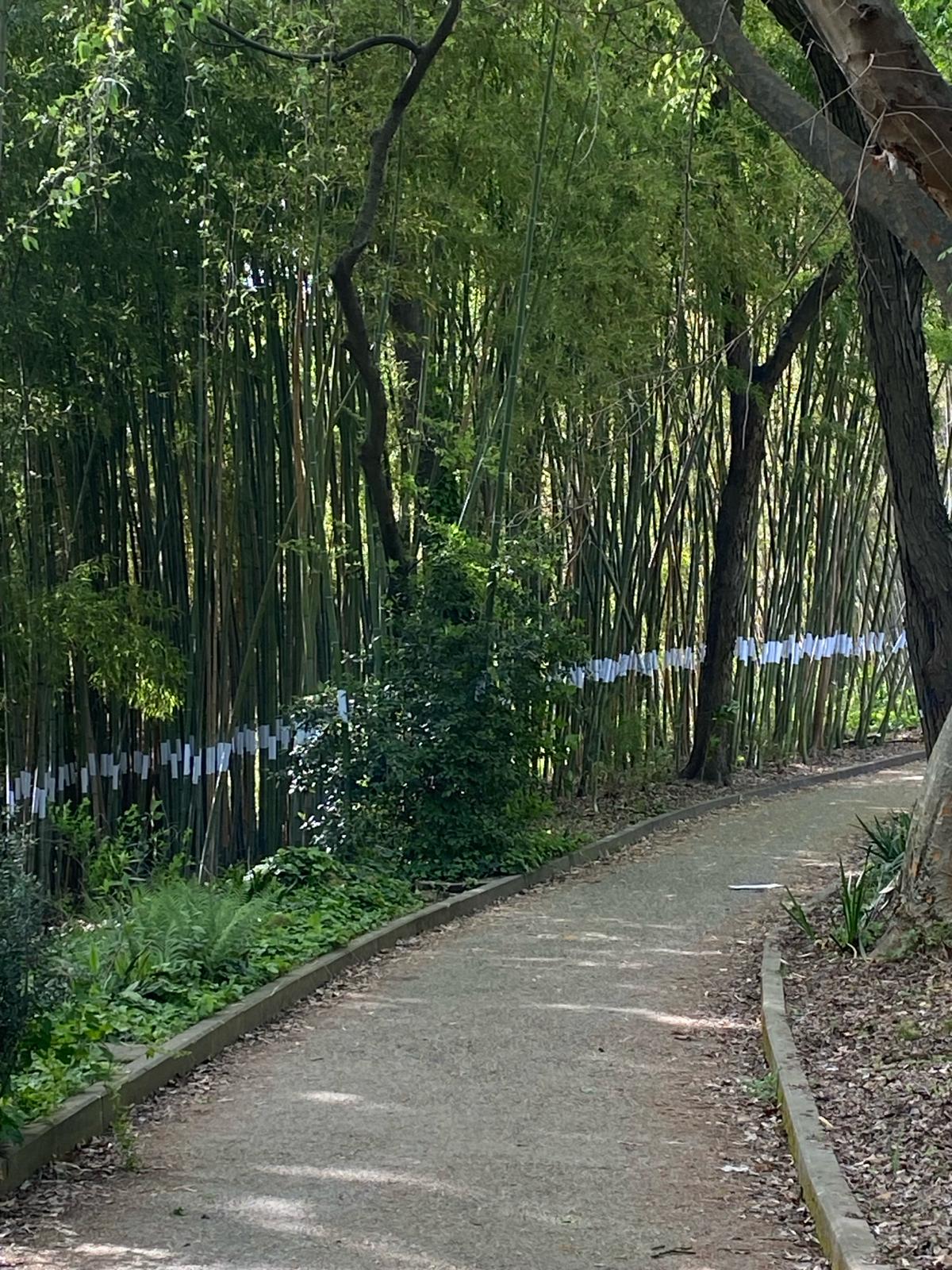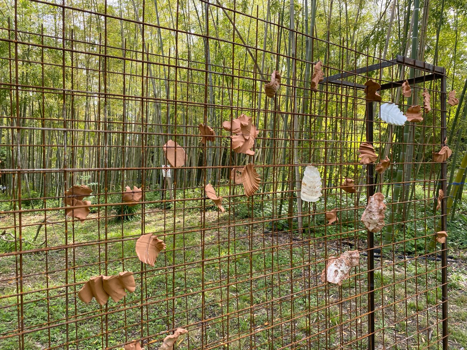 In the area defined as "Continuum", an overall form becomes apparent in the bamboo forest and its development in a continuous perspective, underlined by a point of view that is constant and repeated in the unity of line of a white, natural, not chemically treated fabric, which always wraps the bamboo at the same height. Connecting or cutting elements interact with the viewer's eye to reveal a subjective and intimate relationship with nature. A relationship that creates a physical relationship with one's own body and that of nature; between light and void. The work invites us to enter a conceptual vision of space and time.