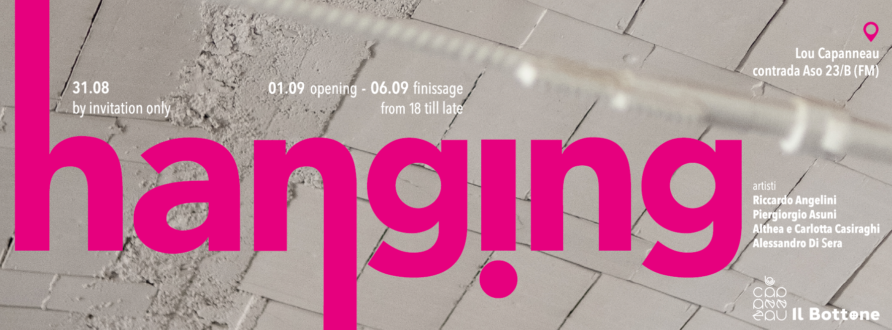 L’associazione Il Bottone, è lieta di annunciare HANGING il primo evento della serie itinerante CUTTING ART, a cura di Domenico de Chirico, che si terrà nell’atelier studio Lou Capanneau. Durante la serata del 31, avranno luogo un’asta ed una raccolta fondi di beneficenza che andranno a finanziare il progetto “Ti Ascolto” (linea diretta di supporto per persone aUette da autolesionismo e/o tendenze suicide). Oltre alla performance, ideata da Lorenzo Ilari e realizzata da Ludovica Del Papa con musiche di BrotherMartino, si terrà la mostra degli artisti residenti dello studio, Riccardo Angelini, Piergiorgio Asuni, Casiraw ed Alessandro Di Sera, i quali apriranno le porte dei loro laboratori oUrendo l’opportunità di interagire direttamente con il luogo di nascita delle opere esposte.