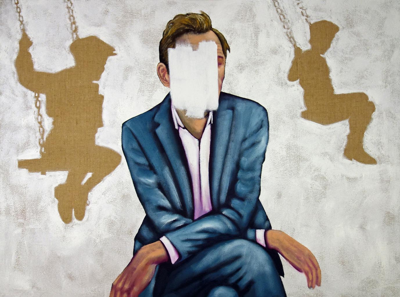 riconoscimento caratteriale ed espressivo. Le sue cancellazioni gentili sembrano alludere al processo di omologazione che pervade la società contemporanea che cerca di annullare le differenze che però restano marcate nello stile e nella posa dei protagonisti. Quasi uno specchio su tela da cui viene fortemente stimolata una riflessione più ampia su quel che resta di ogni vita e su quello che può valere di più nella memoria, se i gesti compiuti o le fattezze del viso. Una memoria, sottolineata da un’ombra decisa, che comunque rimane protagonista, anche se al di fuori di una classica riconoscibilità.