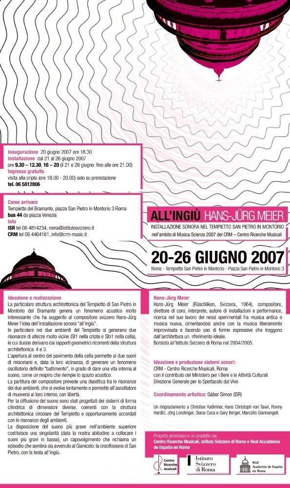 La particolare struttura architettonica del Tempietto di San Pietro in Montorio del Bramante genera un fenomeno acustico molto interessante che ha suggerito al compositore svizzero Hans-Jürg Meier l’idea dell’installazione sonora “all’ingiù”.