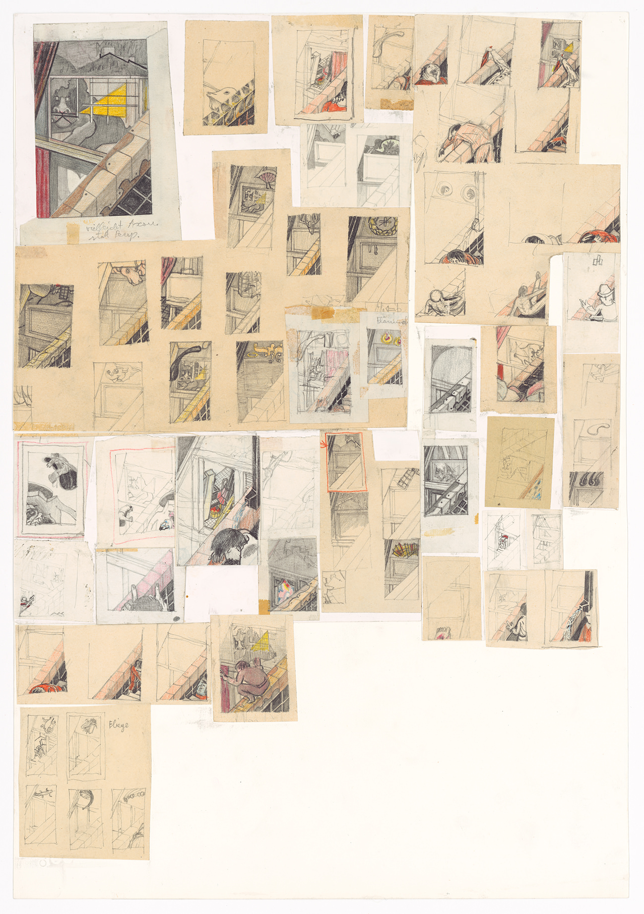 I collage assumono un valore e un'importanza particolare nel lavoro dell’artista, ciò per il fatto che sono realizzati non con stampe o immagini trovate, come avviene solitamente, bensì con soggetti tratti da disegni da egli stesso precedentemente realizzati. Tecnica profondamente legata a una prassi meticolosa e riflessiva, il collage permette una forma di dislocazione artistica nel tempo e nello spazio. Più che alla versione fotografica del collage, quella detta del cut-up, l’orientamento creativo di Knapp è soprattutto riconducibile alla versione dei papiers collés di Picasso e Braque. Nonostante la denominazione della tecnica (letteralmente “carte incollate”), nell’opera dei due artisti cubisti, ad esser ritagliata e incollata non era solamente la carta, i collage venivano realizzati anche con frammenti, oggetti e anche scarti appartenenti al mondo del quotidiano e della cultura popolare. La tecnica artistica del collage s’inscrive nella storia dell’arte come espressione intrisa di vissuto, che racconta una versione alternativa del mondo reale e si esprime attraverso la libera associazione di immagini già esistenti. Diversamente, i collage di Hans Knapp non raccontano nulla della realtà, non criticano e non si appellano ad alcunché di esterno, la loro funzione è rinnovata perché rimane pressoché privata, tutta legata al momento espressivo intimo e immaginifico del disegno. Le opere sono intrise di un vissuto visionario che appartiene solo e soltanto all’interiorità dell’artista, alla sua ossessione. Ad innestarsi è un dialogo interno, una riflessione sul fare artistico e sul disegno visto come espressione primaria che accompagna l’artista da tutta una vita. Knapp agisce come a liberare i soggetti dal loro ruolo e rimetterli in gioco, ne rinnova la funzione e la stessa visione, cerca di fissare qualcosa di sempre sfuggente. In alcuni casi compare un elemento erotico, contati tra un uomo e una donna, un rapporto che si sviluppa in modo evidente ma che non è perfettamente ricostruibile. Il disegno diventa allora una finestra, uno sguardo sull’intimità, un'operazione voyeristica come nella grande tradizione avviata da Marcel Duchamp. L’osservazione in questo caso diventa sguardo, la realtà compare come immaginazione assumendo al contempo i contorni del desiderio.