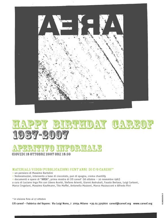 vent’anni di distanza C/O careof, riconosciuto Archivio Storico dal Ministero per i Beni e le Attività Culturali nel 2006 e ormai prossimo al trasferimento nella sua sede definitiva (2008) della Fabbrica del Vapore, ripropone una lettura storica di quella stessa mostra: ripresentare i lavori originali e documentazioni di AREA apre una riflessione sul panorama artistico milanese di fine Anni ’80 e al tempo stesso sul percorso compiuto da C/O careof.