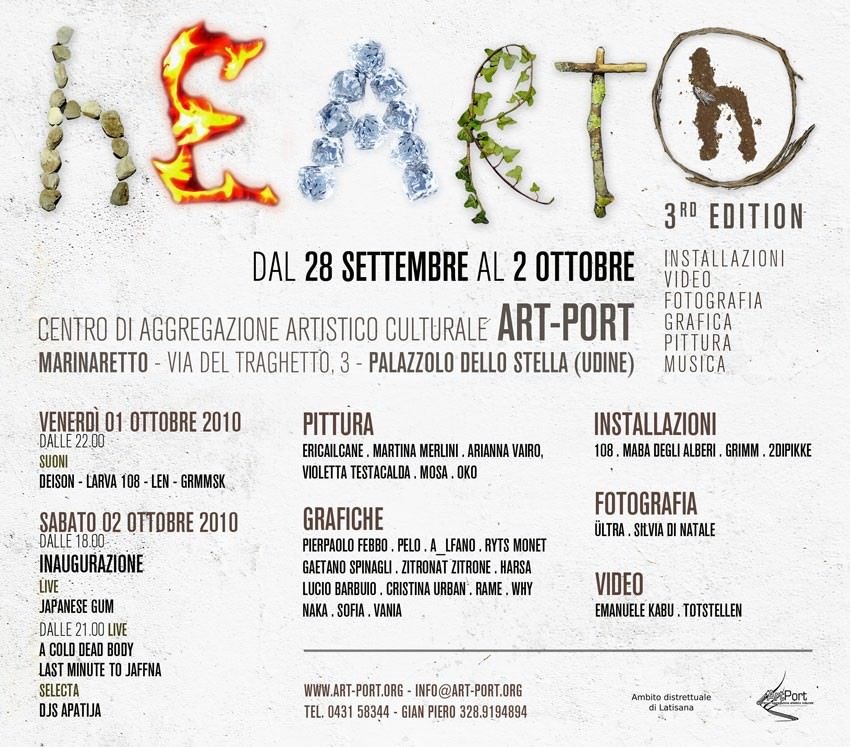 Il primo appuntamento della rassegna, in programma per venerdì 1 ottobre, a partire dalle 22, sarà dedicato infatti alle musiche curate da Deison, Larva 108, Len, Grmmsk. Suoni protagonisti anche nel giorno seguente. Sabato 2, alle 18, l’inaugurazione vera e propria di “heart(h)” con la presentazione delle opere e della mostra degli artisti verrà accompagnata dal live dei Japanese gum, e a partire dalle 21, dall’esibizione dei A cold dead body e dei Last minute to jaffna, a seguire selezione musicale a cura dei Djs apatija.