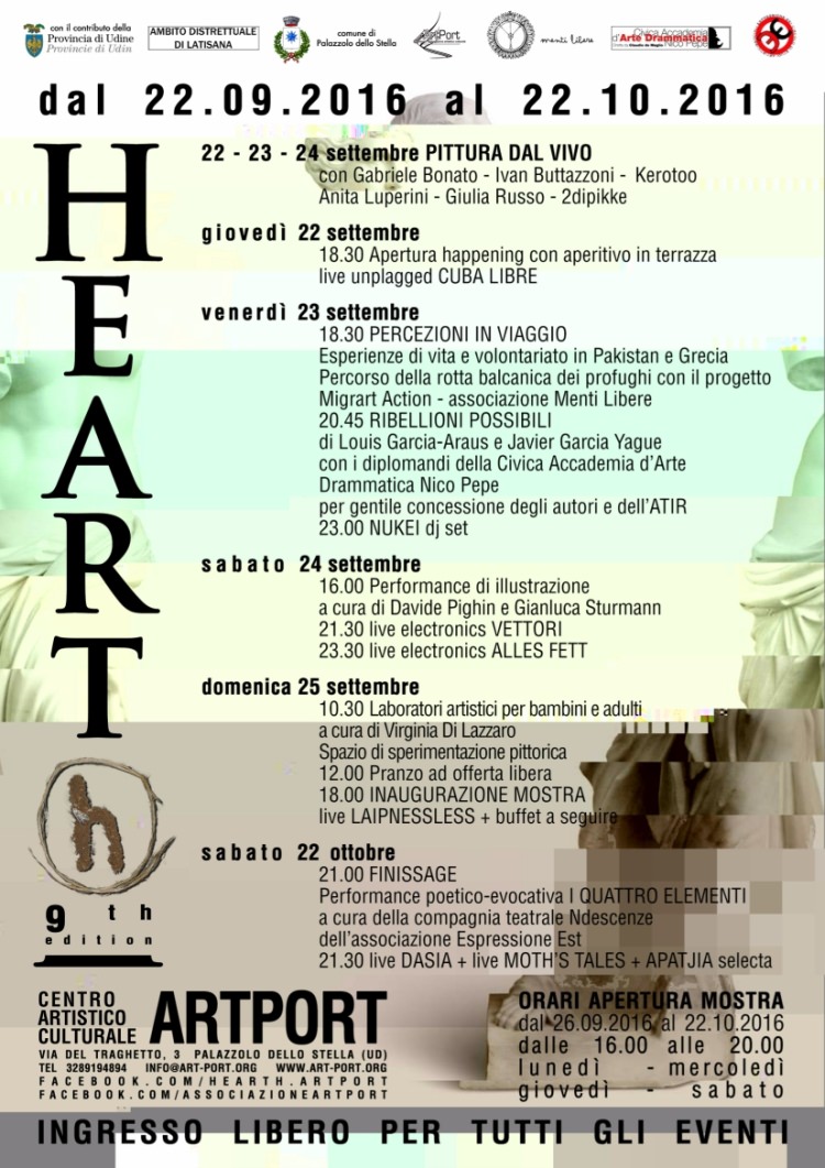 Heart(h) inizierà giovedì, con l’aperitivo in terrazza accompagnato dal live unplugged dei Cuba Libre. Venerdì, “Percezioni in viaggio”, racconti di esperienze di vita e volontariato in Pakistan e Grecia e del percorso della rotta balcanica dei profughi nell'ambito del progetto Migrart Action dell’Associazione Menti Libere. Seguirà lo spettacolo teatrale “Ribellioni possibili” di Louis Garcia-Araus e Javier Garcia Yague con i diplomandi della Civica Accademia d'Arte Drammatica Nico Pepe. Chiusura drum 'n bass con Nukei dj. Sabato, ultimo giorno di live painting e pomeriggio dedicato al fumetto, con la performance di illustrazione a cura di Davide Pighin e Gianluca Sturmann. In serata live electronics con Vettori e Alles Fett.