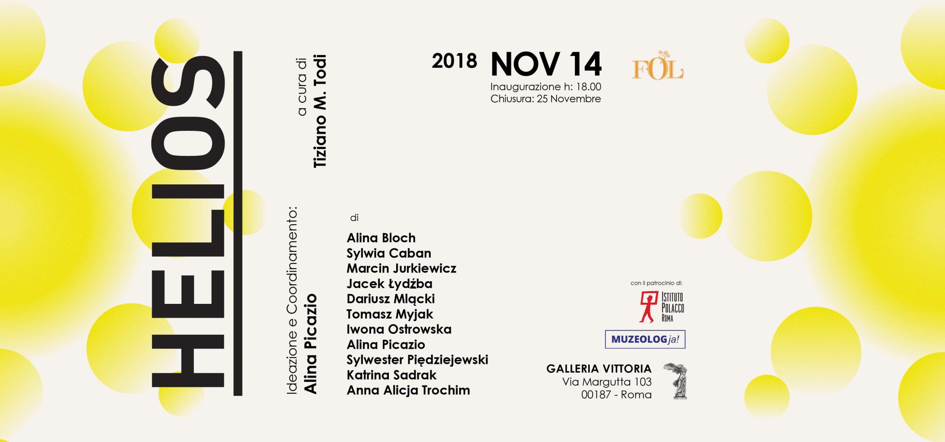 Mercoledì 14 Novembre alle ore 18.00 presso la Galleria Vittoria, Via Margutta 103, sarà inaugurata Helios mostra a cura di Tiziano M.Todi visitabile fino al 25 Novembre 2018.
