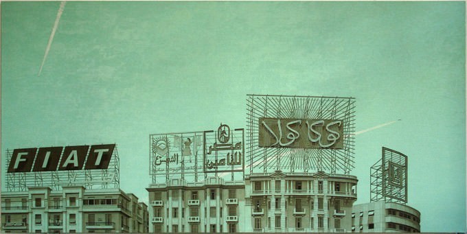 The paintings portray minimal landscapes which are flattened on the horizon: a long strip of beach (On economy planet, 2010), the details of large merchant ships which plough the waves of a sea whose presence we can only imagine, the details of buildings with huge advertising hoardings towering over them (Sonne scheint, 2009). Here it is the sky that occupies most of the space of the painting, portrayed as the large uniform expanse of green that forms the background. This colour embodied the dense oily texture of the atmosphere in which we move today, an atmosphere that is getting warmer every day, while the levels of oxygen are gradually falling.