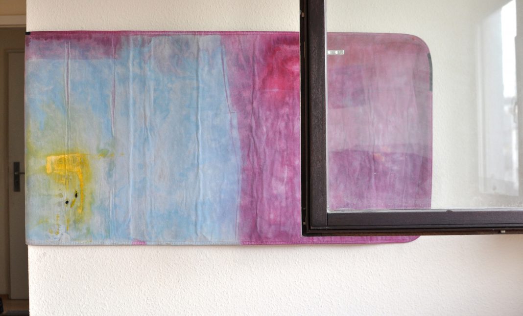 Kaarstein’s textile works for the exhibition can be seen as dialogue medium for what to catch. Or maybe more precisely, monologue catalyst for seeking and selecting. The exhibited works have simple basic materials – towels and thin mattress protectors – but the final works span from everyday material simplicity via vibrating nearness to trembling intimacy. Just the way the towels hang make them more thoughtful and severely present than many of the surrounding objects in everyday rooms. When added the surface landscape they are perceived as almost emotionally seductive. Variations in the intensity of the expression make alteration in the suggestive vibrations and do not fixate specific goals or a style.