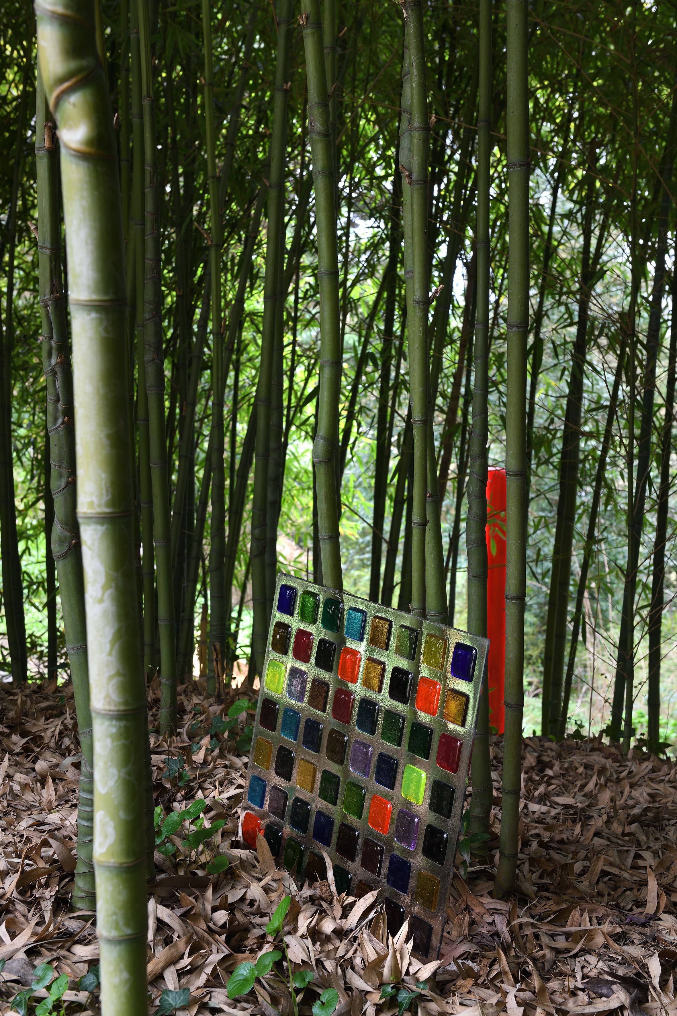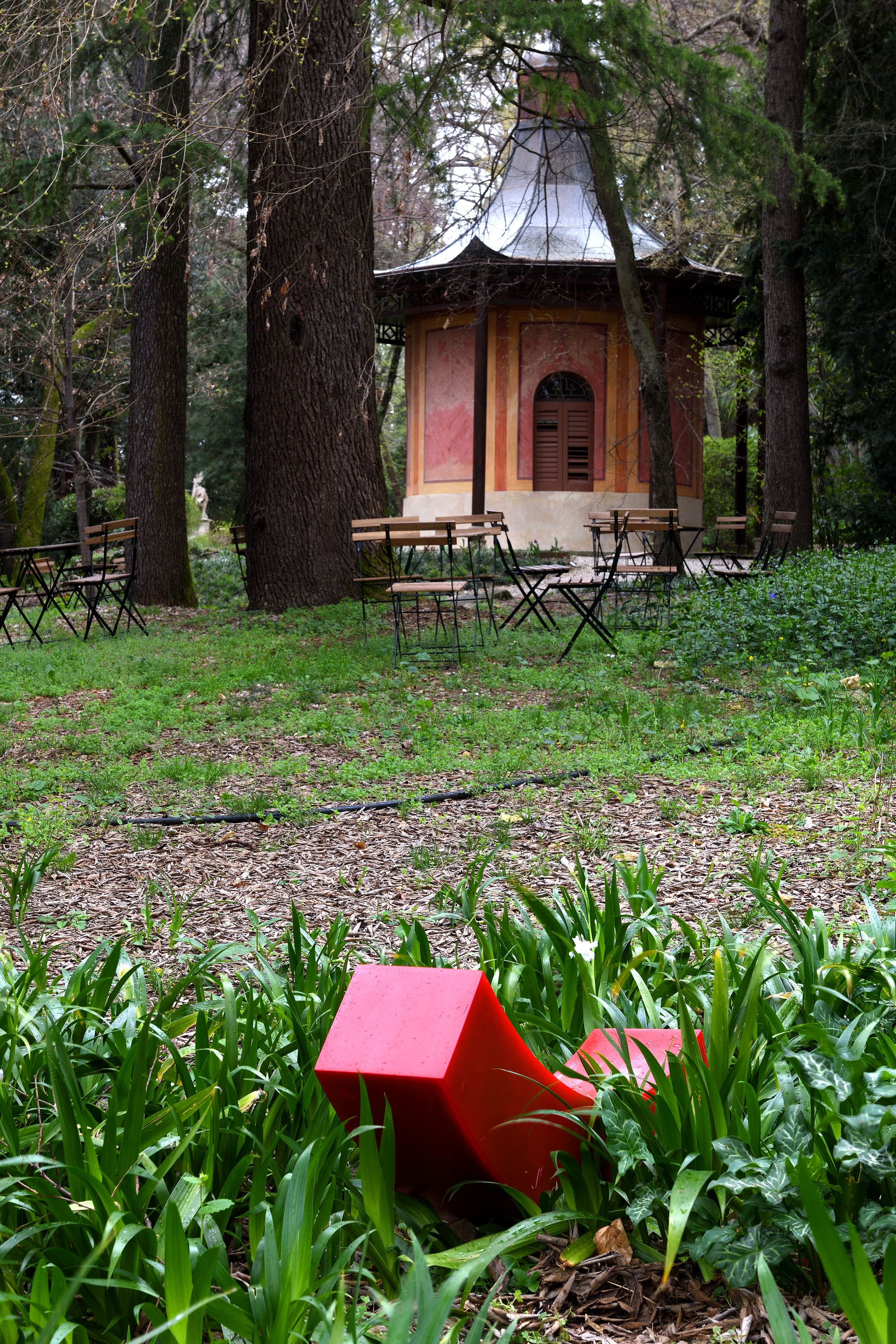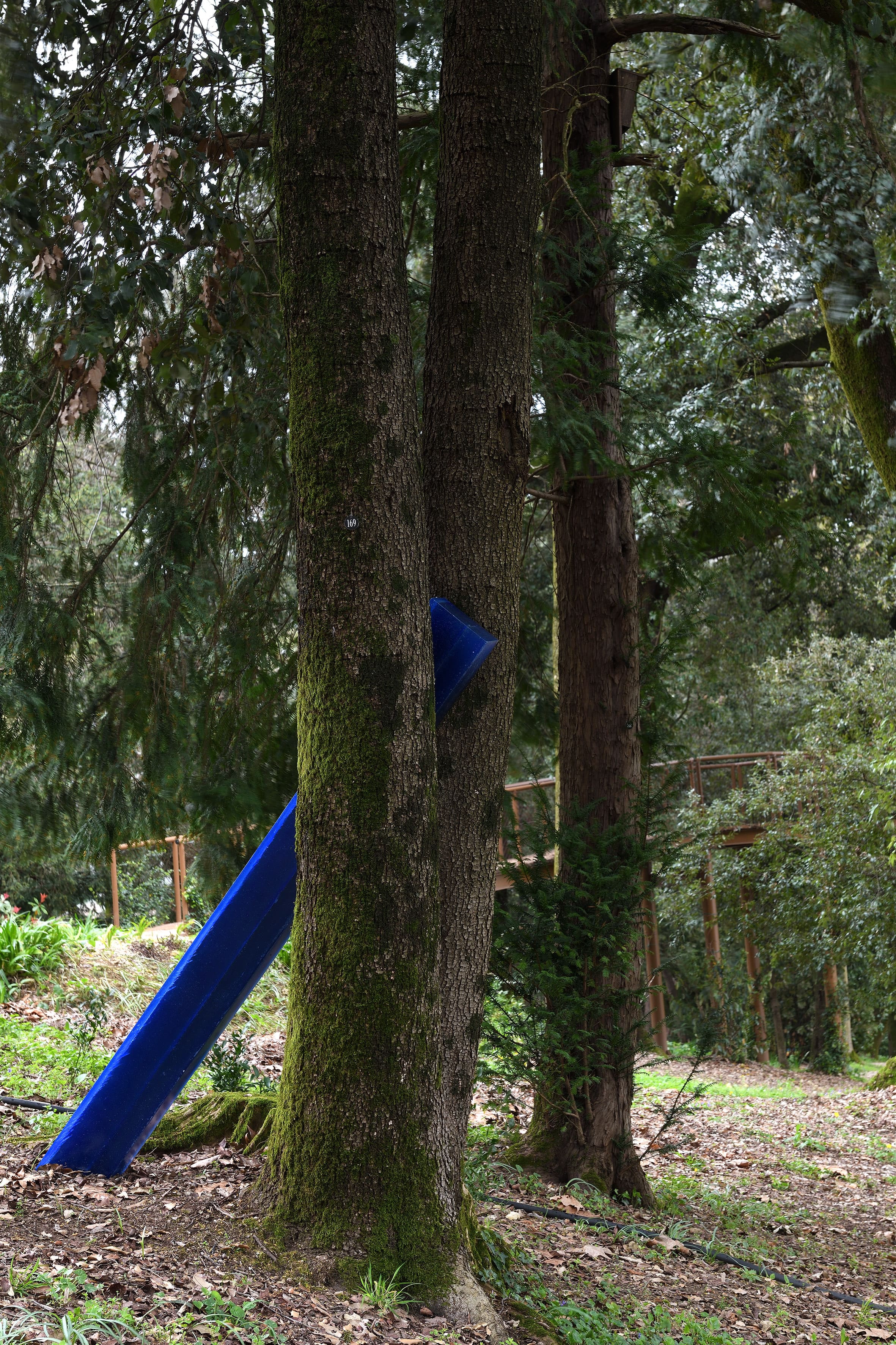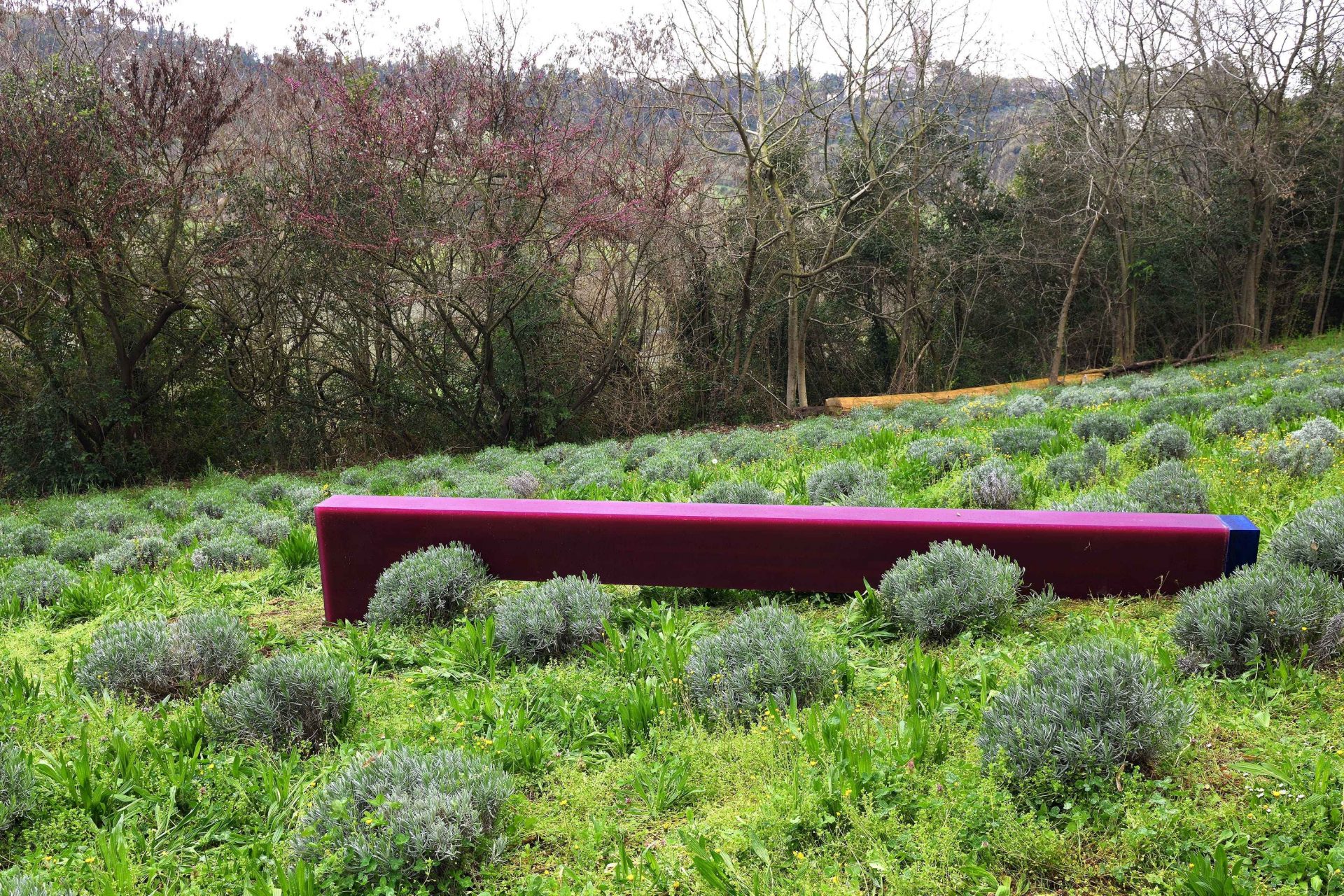 L’installazione di Herbert Hamak, costituita da blocchi, colonne, sbarre, cubi, curve di resina e pigmento di colore - quanto di più distante dallo schiudersi di un fiore – aggiunge informazioni fondamentali al processo che svolge la natura, facendosi bussola, sestante e clessidra in un parco che vive.