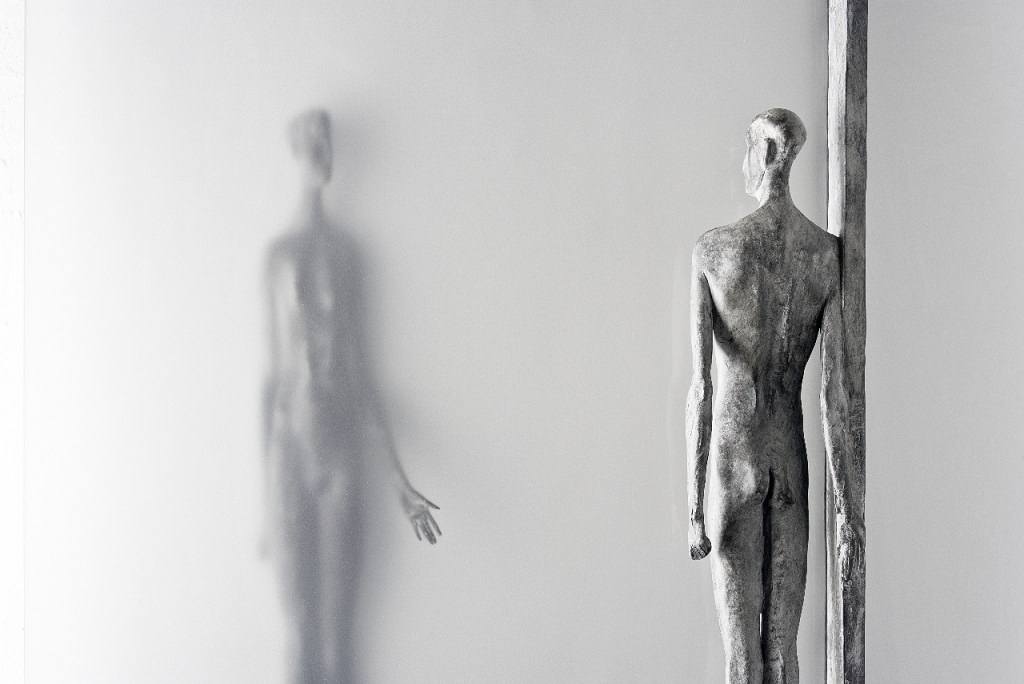 l’artista utilizza materia classica: legno naturalmente, bellissimo e caldo, ma anche gesso, pietra, bronzo, vetroresina e creta. Materie dalle quali far nascere figure umane solitarie anche quando numerose, si affollano su una sola riga. Figure emotive, commoventi, che suscitano emozioni.