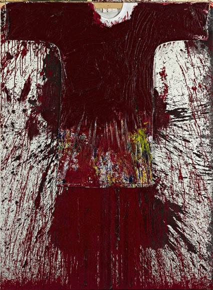 Simulacro dell’artista – presenza di cui ogni singolo lavoro non è mai privo - campeggia sospesa nel vuoto una tunica impregnata di colore. L’indumento è infatti uno di quelli indossato da Nitsch durante la sua espressione artistica, in una continuità ideale con i kimono di un altro viennese illustre: Gustav Klimt. La tunica si ammanta di religiosità, e diviene una veste rituale, al pari dei paramenti sacerdotali. L’artista è infatti il celebrante della cerimonia da cui nasce l’opera d’arte.