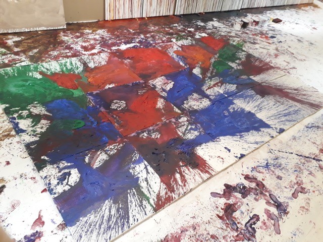 Il primo nucleo espone in galleria alcuni dipinti “versati” su tela e disposti nella sequenza in cui sono stati eseguiti, creando un continuum di opere di dimensioni diverse, che variano dagli 80 per 100 cm, fino ai due metri per tre.