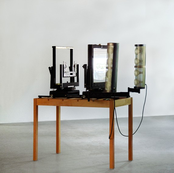 Dall’indagine sulle modalità percettive deriva poi una visualizzazione dello spazio alterata da illusioni ottiche, lenti d’ingrandimento, fenomeni di rifrazione e distorsione, e una tensione tra spazio reale e spazio descritto, tramite modelli di oggetti o attrezzature fotografiche che suggeriscono dimensioni spazio-temporali ‘altre‘.