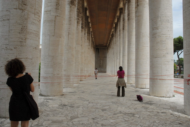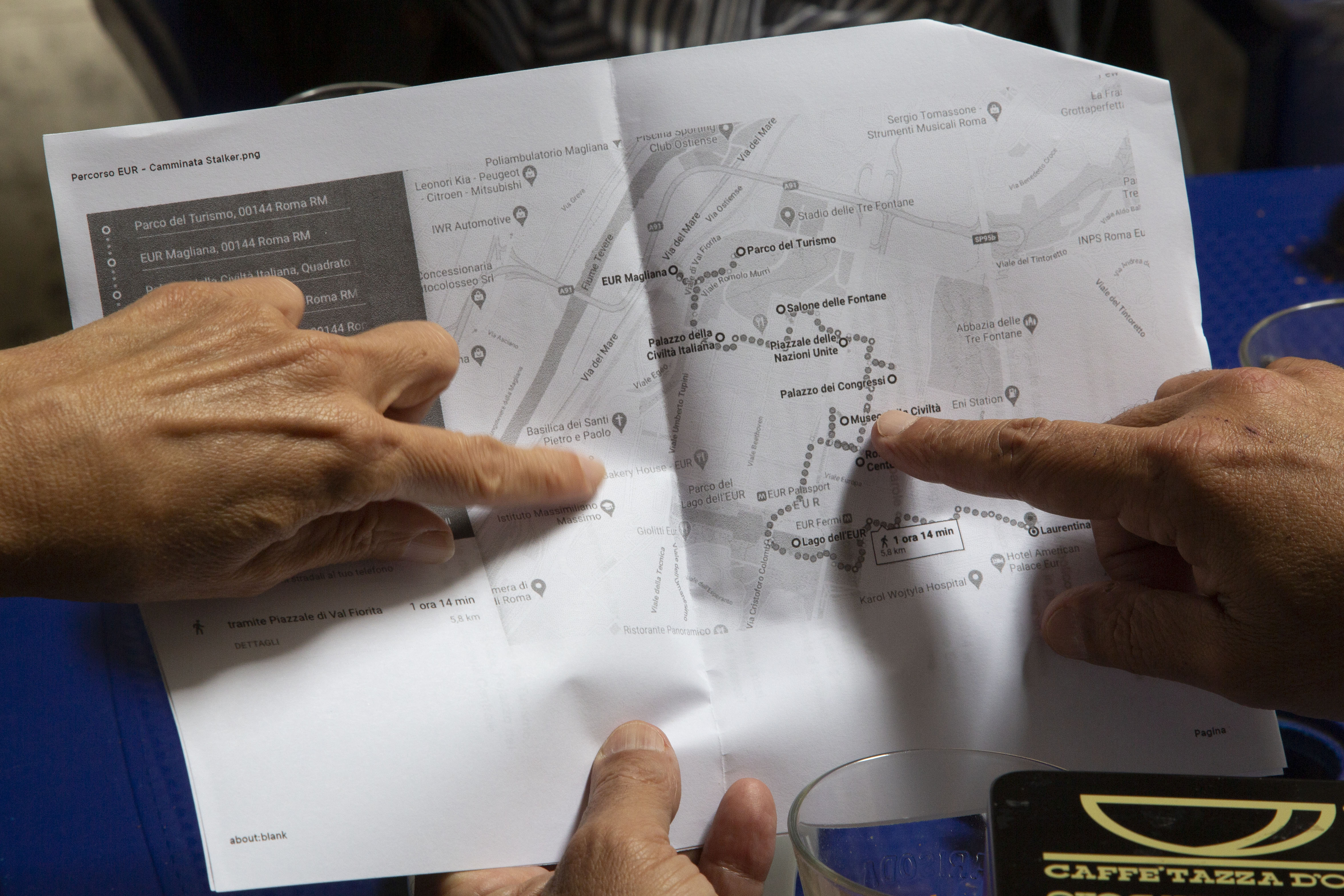 Il 15 giugno Stalker conduce un’esplorazione dell’EUR, complesso architettonico-urbanistico che si colloca in una zona di raccordo tra il centro cittadino e il litorale romano, e che costituisce una delle più evidenti tracce del passato fascista e colonialista italiano. Intendendo l’azione dell’attraversamento come una pratica di incontro e di messa in relazione con le stridenti contraddizioni di questi luoghi, Stalker si propone di interrogare alla luce delle urgenze del presente le complessità che caratterizzano l’EUR, il problematico portato ideologico dell’impianto urbanistico e architettonico fascista, il suo combinarsi con altre e più recenti tracce della storia italiana. La volontà di mettere a nudo la violenza e le criticità raccontate da questi edifici, si accompagna al desiderio di reinterpretare e ribaltare il loro significato simbolico, al fine di permettere che la memoria dei luoghi e delle comunità si possa re-incontrare con il presente, generando nuove narrazioni.