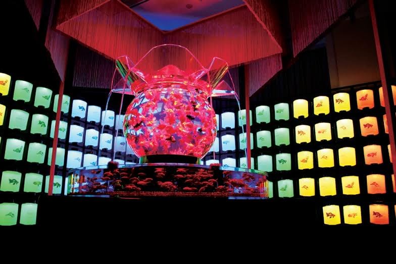 Le vasche di vetro prendono vita grazie alle danze acquatiche e sinuose del pesce rosso: quella più imponente è Oiran (cortigiana), ispirata ai quartieri di piacere del periodo Edo. Le cortigiane erano donne colte ed eleganti con interesse per l’arte, la musica e la poesia, che vivevano isolate dalla società. Oiran, realizzata con sette colori cangianti, contiene 1.000 pesci rossi, ricreando un’atmosfera affascinante e misteriosa. Un’altra installazione che riflette la tradizione nipponica è Kimonorium, ispirata all’arte manifatturiera del kimono KyoYuzen: una vasca bidimensionale con giochi di luce e proiezioni. La grande vasca Ooku, larga tre metri, evoca l’harem all’interno del Castello di Edo (architettura militare di Tokyo, città anticamente chiamata Edo): luogo d’incontri di mogli, figlie e concubine. Giyamanrium è ispirata ai diamanti e al vetro del periodo Edo, con luci e colori che fanno brillare la vasca e i pesci rossi al suo interno. I richiami dell’allestimento della mostra alla cultura giapponese sono infiniti: altre installazioni riproducono i famosi giardini giapponesi, la luce delle lanterne come nella vasca Bonborium, e i fiori di ciliegio nella vasca Sakura-rium.